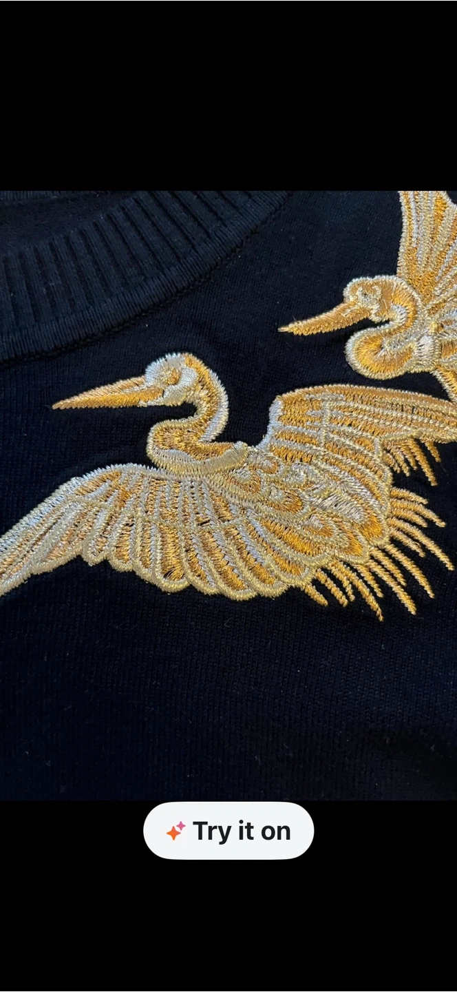 This black sweater features intricate gold crane embroidery on the front. It's made from a soft knit material. Size is XS/TP.