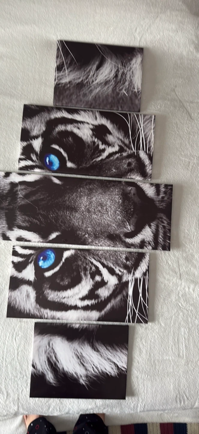 This is a 5-piece canvas wall art set featuring a black & white tiger with striking blue-eyes! The artwork is printed on canvas, ready to hang. It's a striking animal picture decor piece.