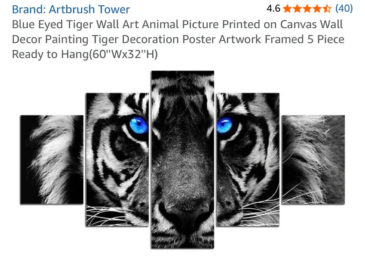 This is a 5-piece canvas wall art set featuring a black & white tiger with striking blue-eyes! The artwork is printed on canvas, ready to hang. It's a striking animal picture decor piece.