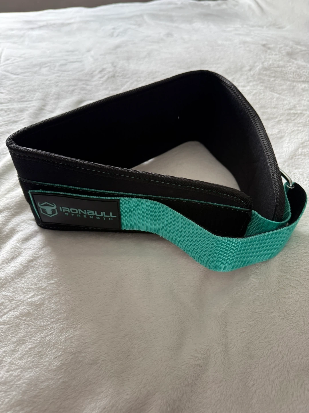 This is an Ironbull Strength weightlifting belt. It's black with a teal strap and buckle. Belt for weightlifting support. Brand New, Never used. Size Medium.