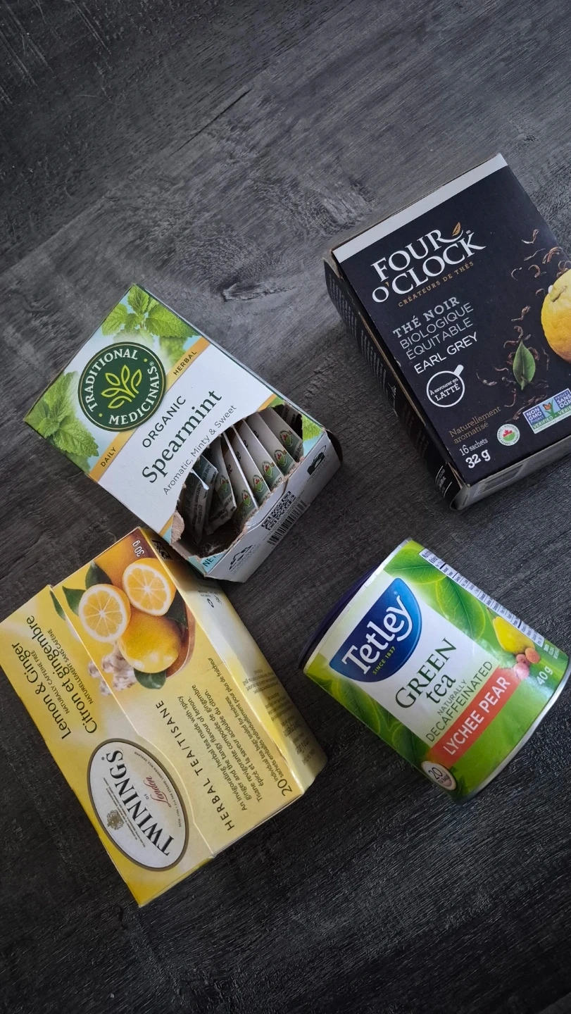 Includes Traditional Medicinals Organic Spearmint herbal tea, Twinings Lemon & Ginger herbal tea, Tetley Green Tea Decaffeinated Lychee Pear, and Four O'Clock Earl Grey tea. Various quantities and original packaging shown.
