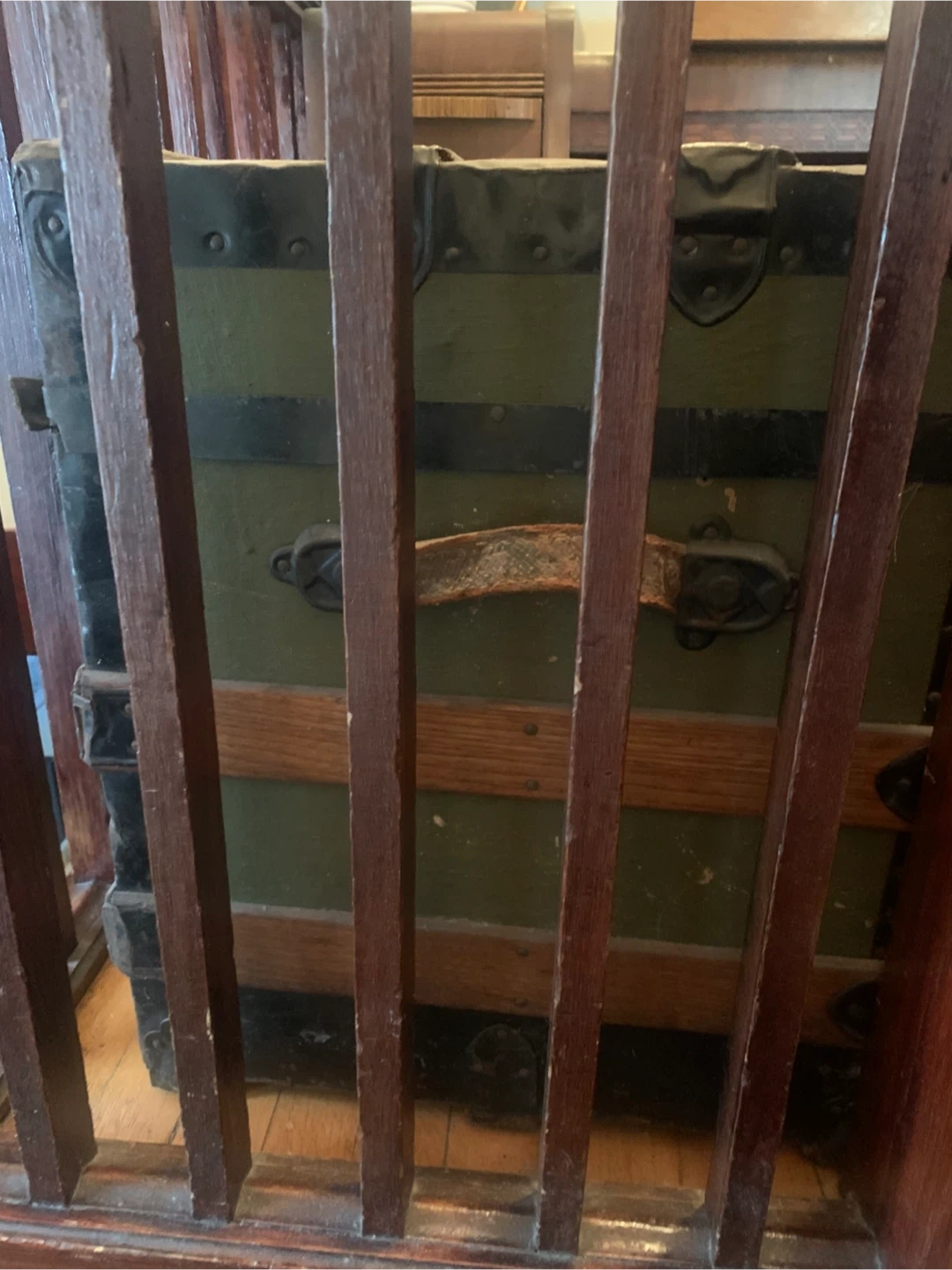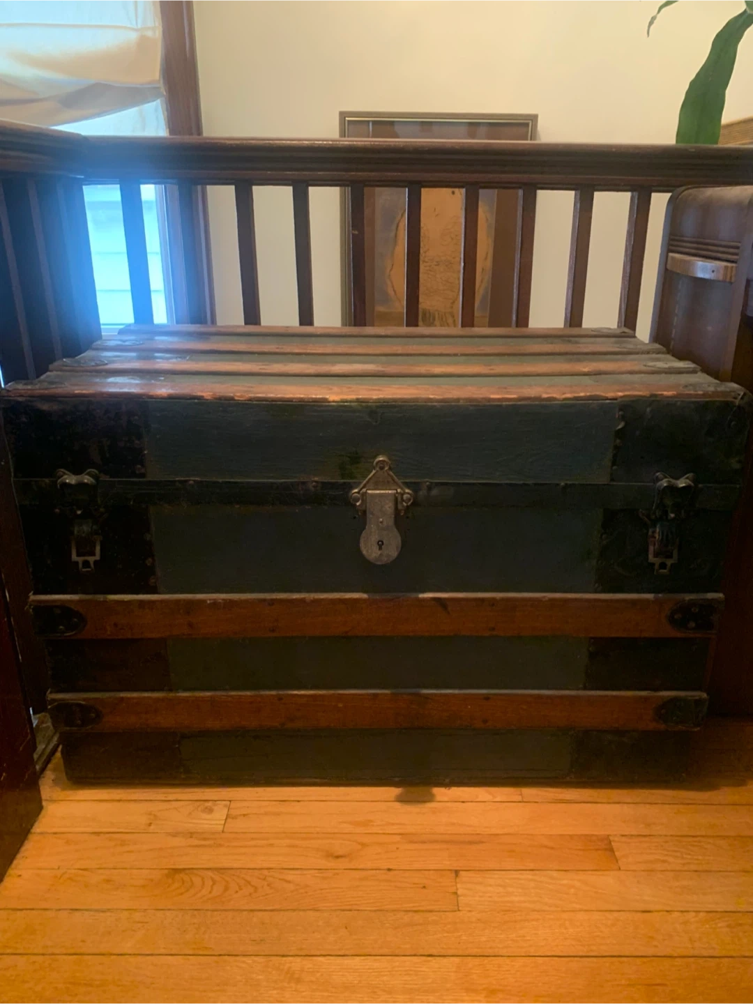 This is a vintage steamer trunk with decorative lithograph inside and metal hardware. It has a green and wood exterior. It's a substantial piece perfect for storage or decor.