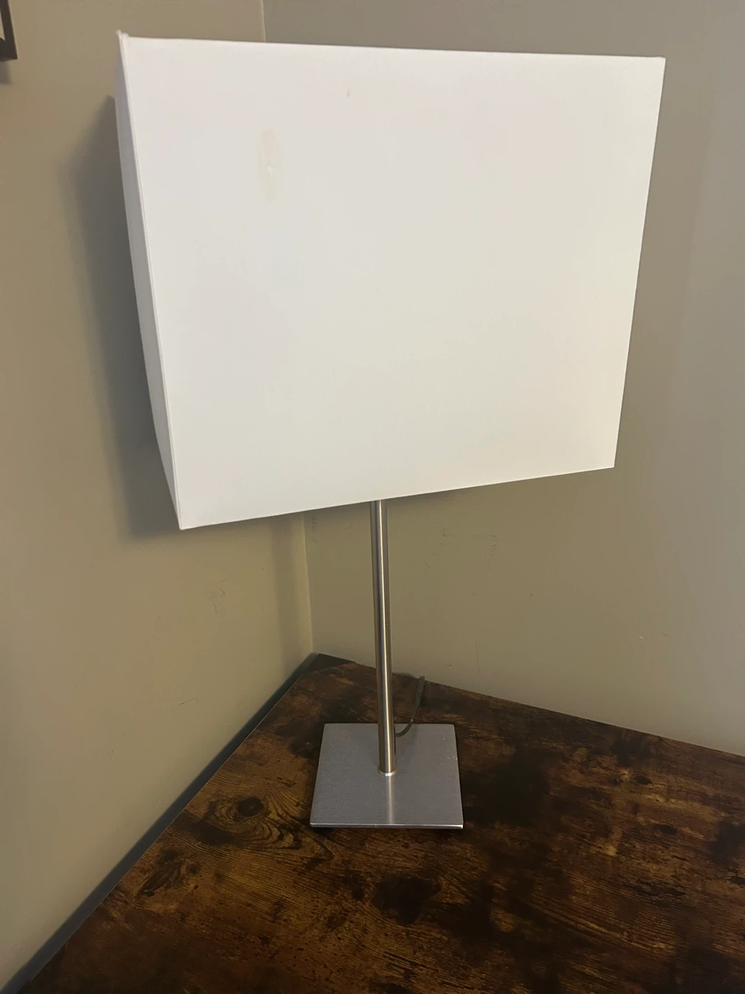 This table lamp features a white rectangular shade and a sleek, square metal base. It's a simple and modern design that will fit into most decors. The metallic finish on the stand and base adds a contemporary touch. It provides ambient lighting for a desk or side table.