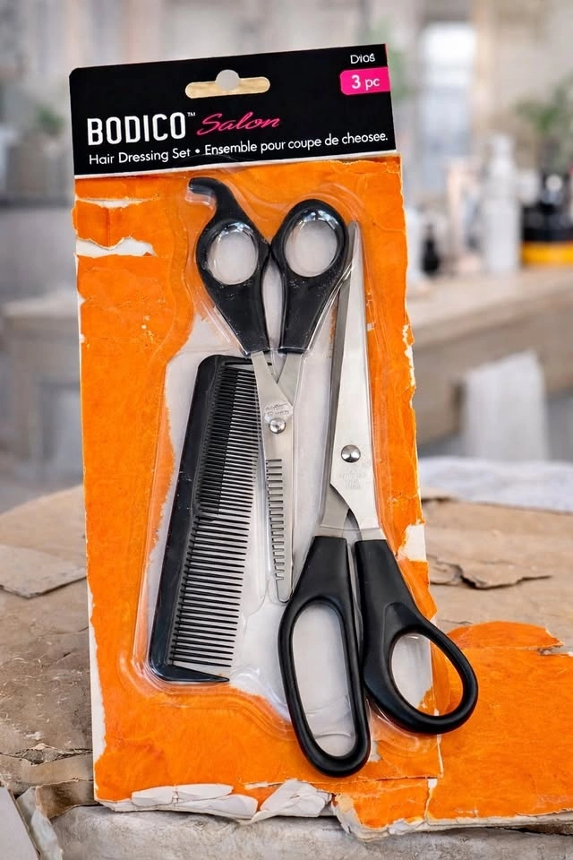Professional-style hair cutting set by Bodico Salon. Includes: Two pairs of scissors (great for trimming, layering, or backup), One fine-tooth comb. New / unused (packaging is torn but items are untouched). Lightweight and easy to handle. Perfect for home haircuts, kids’ trims, beards, or DIY touch-ups. Great little starter or backup set. Simple, practical, and does the job without drama.