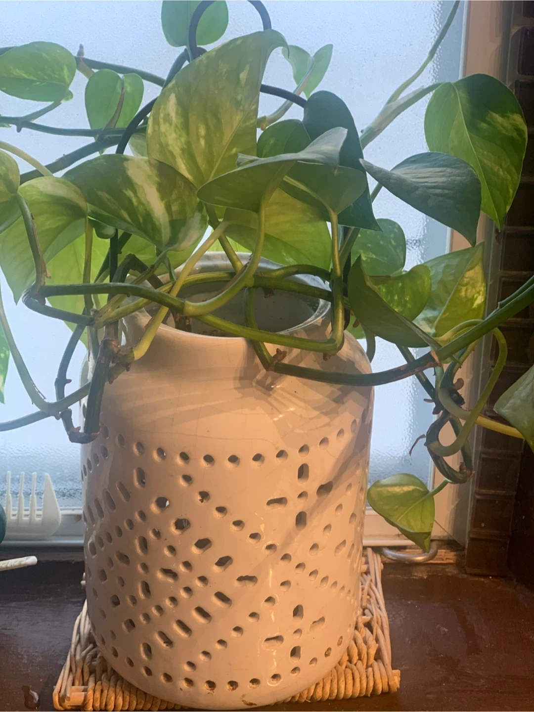 A vibrant Pothos plant potted in a stylish white ceramic pot with a unique perforated design. It's a beautiful addition to any home or office space. The plant is well-established and healthy. This plant thrives in various light conditions.