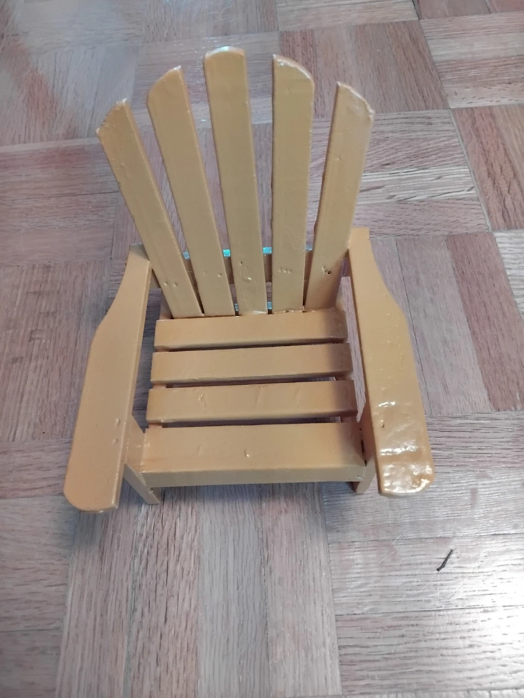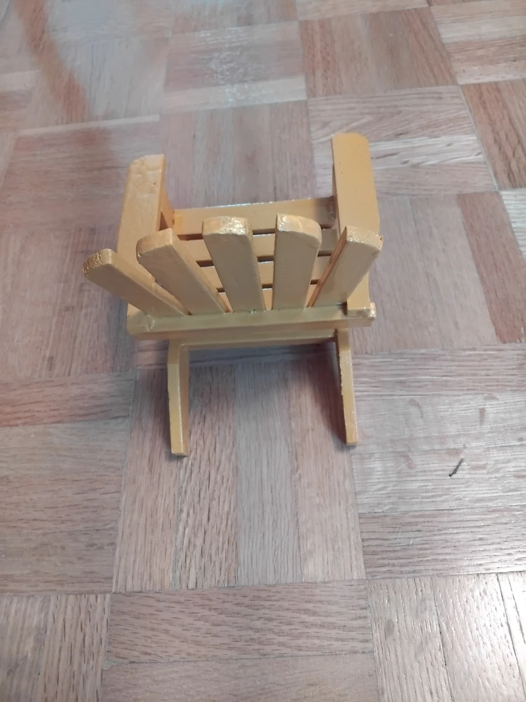 This is a charming miniature Adirondack chair, perfect for decorative accents. It's crafted from wood and painted a warm yellow colour. This little chair would look neat on a shelf or as part of a diorama!