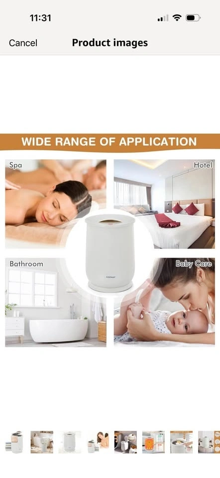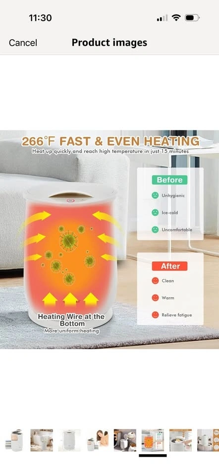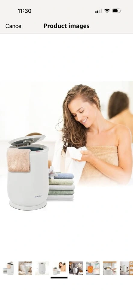 Brand new in box! This ultra large capacity 21L towel warmer fits 2 oversized towels, blankets, bathrobes, and more. It heats up quickly, reaching 266°F in 15 minutes for evenly warmed items. The galvanized sheet inner provides great heat preservation for a spa-like experience. Features a flip-top lid with a built-in handle and a single button for operation. Includes a detailed manual. The warmer has a 60-minute heating cycle and auto shut-off for safety, with a hot surface indicator when the interior exceeds 122℉.