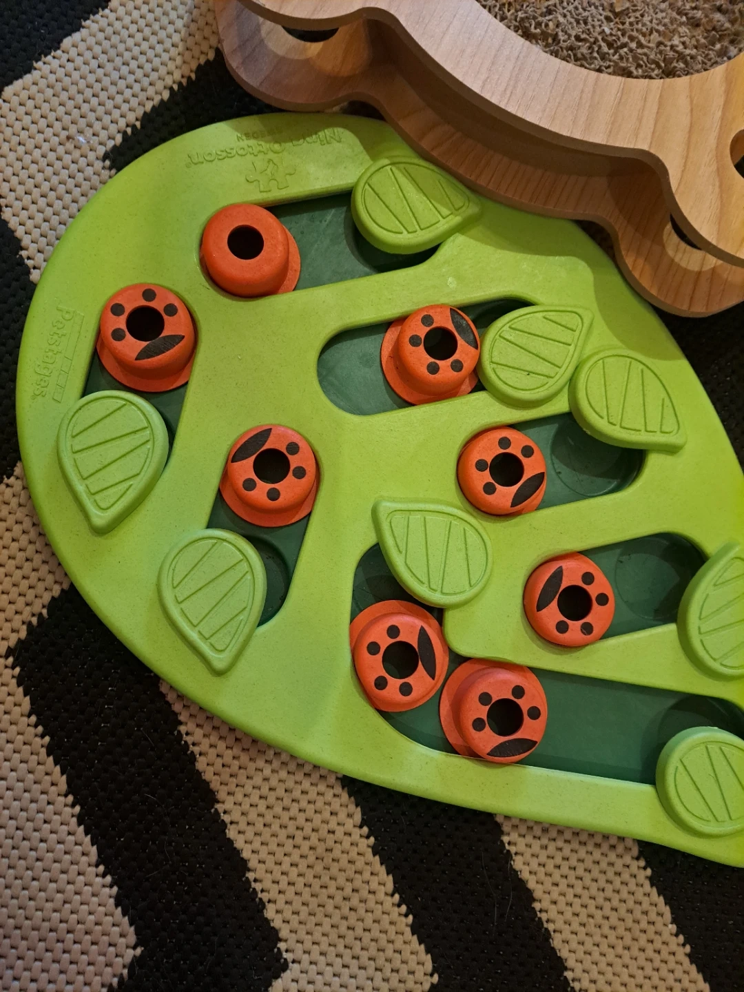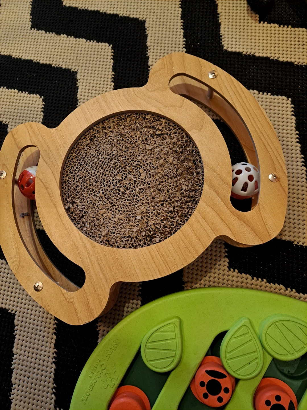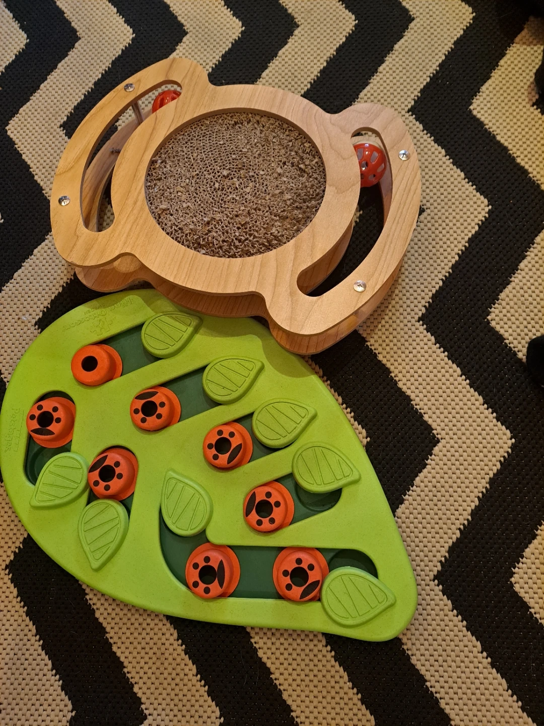 This is a Petstages puzzle toy with multiple compartments for treats. It also includes a wooden cat scratcher with a built-in ball toy. Great for keeping pets entertained! also goof for smaller animals like ferrets