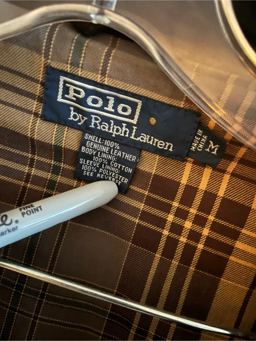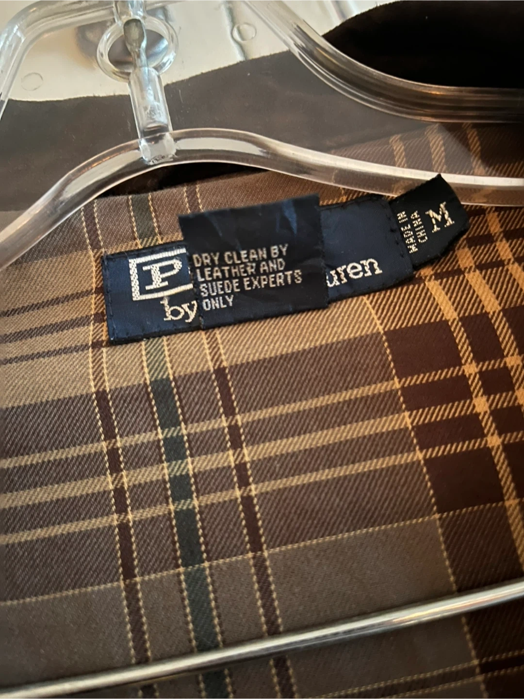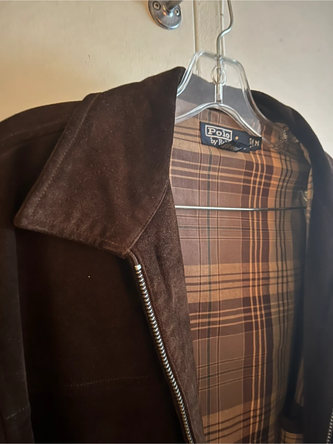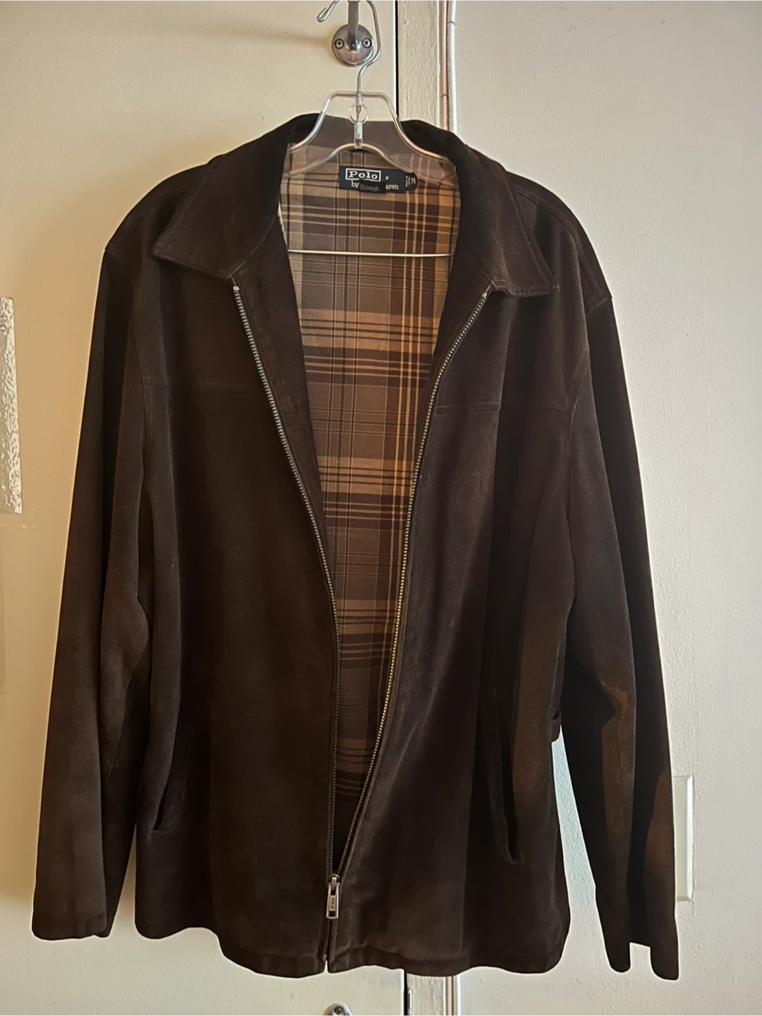 Vintage brown suede leather jacket by Polo by Ralph Lauren. Shell is 100% genuine leather. Plaid lining is 100% cotton. Sleeve lining is 100% polyester.