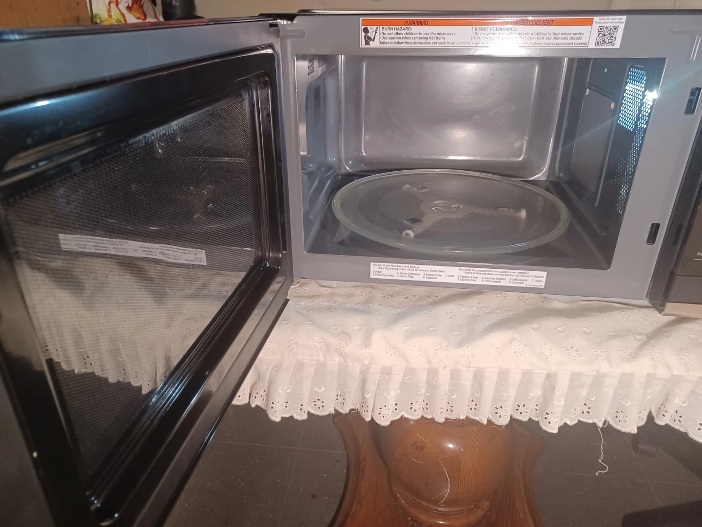 This is a black Panasonic Genius microwave oven. It features a turntable and a digital display. It has various quick cook settings for convenience. Very clean. Manufactured : 2025.