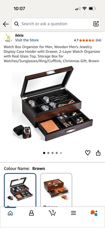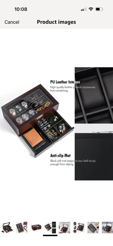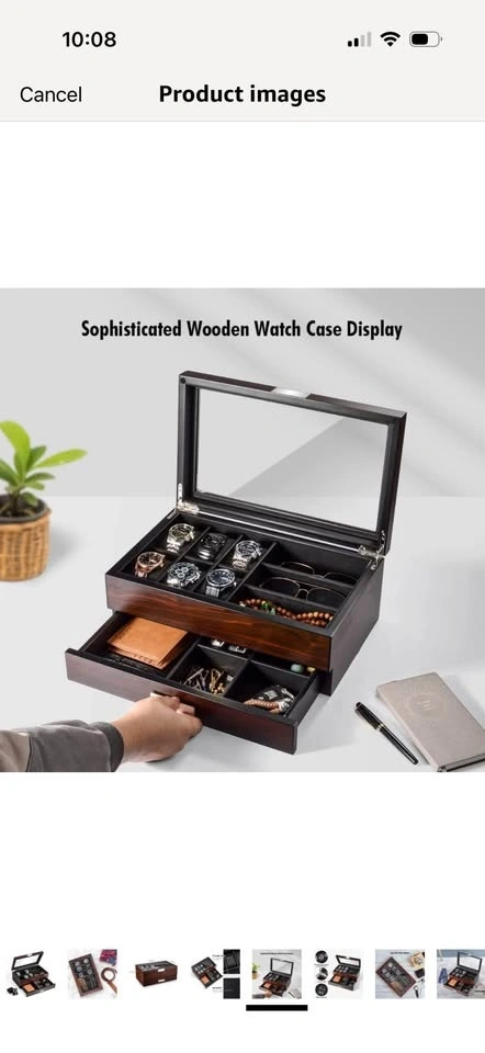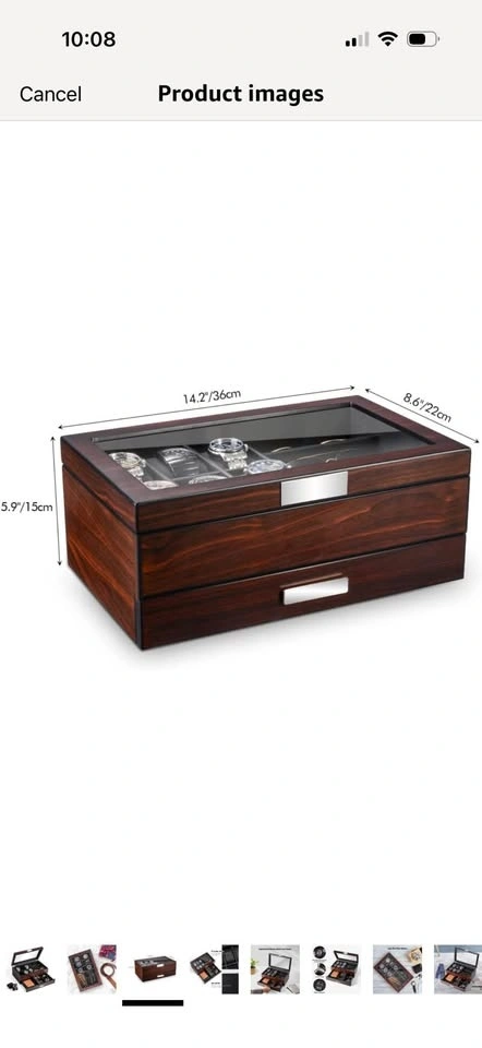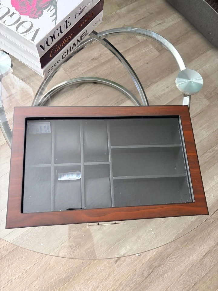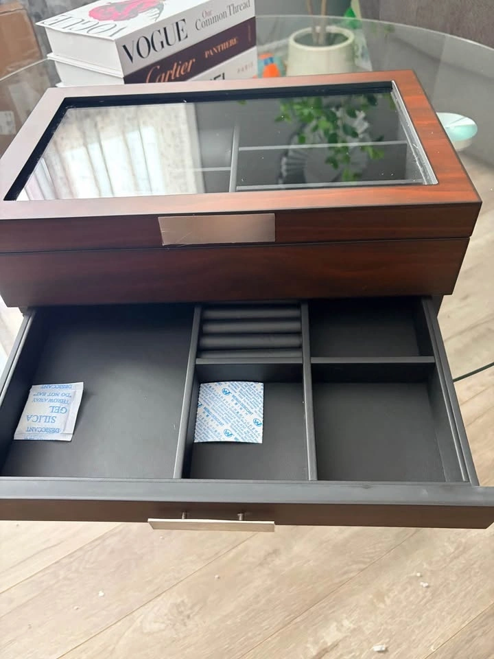 Brand new in opened box. This luxury watch holder is made of natural walnut wood with a classic PU leather interior and soft cushion pillows for different watch sizes. The bottom is designed with thick flocking to avoid scratching your desktop. It preserves your precious items for years to come. The 2-level design has 6 watch slots and other compartments for accessories like eyeglasses, sunglasses, cufflinks, rings, earrings, bracelets, neckties, pens, wallets, and more. Keep your items organized and on display. The lid features a large, durable glass window that protects your watches and other accessories while allowing you to easily see and choose what to wear. It effectively protects your items from dust, falls, and scratches.