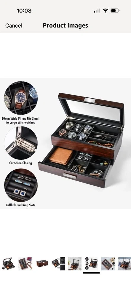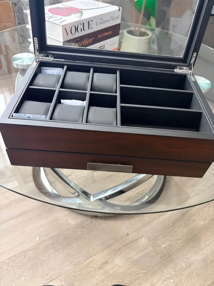 Brand new in opened box. This luxury watch holder is made of natural walnut wood with a classic PU leather interior and soft cushion pillows for different watch sizes. The bottom is designed with thick flocking to avoid scratching your desktop. It preserves your precious items for years to come. The 2-level design has 6 watch slots and other compartments for accessories like eyeglasses, sunglasses, cufflinks, rings, earrings, bracelets, neckties, pens, wallets, and more. Keep your items organized and on display. The lid features a large, durable glass window that protects your watches and other accessories while allowing you to easily see and choose what to wear. It effectively protects your items from dust, falls, and scratches.