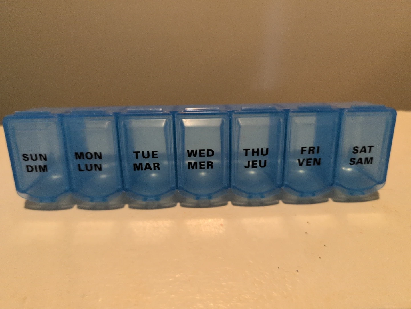 This blue pill organizer has seven compartments, one for each day of the week. Each compartment is clearly labelled with the days of the week in English and French. It's perfect for keeping your daily medications organized.