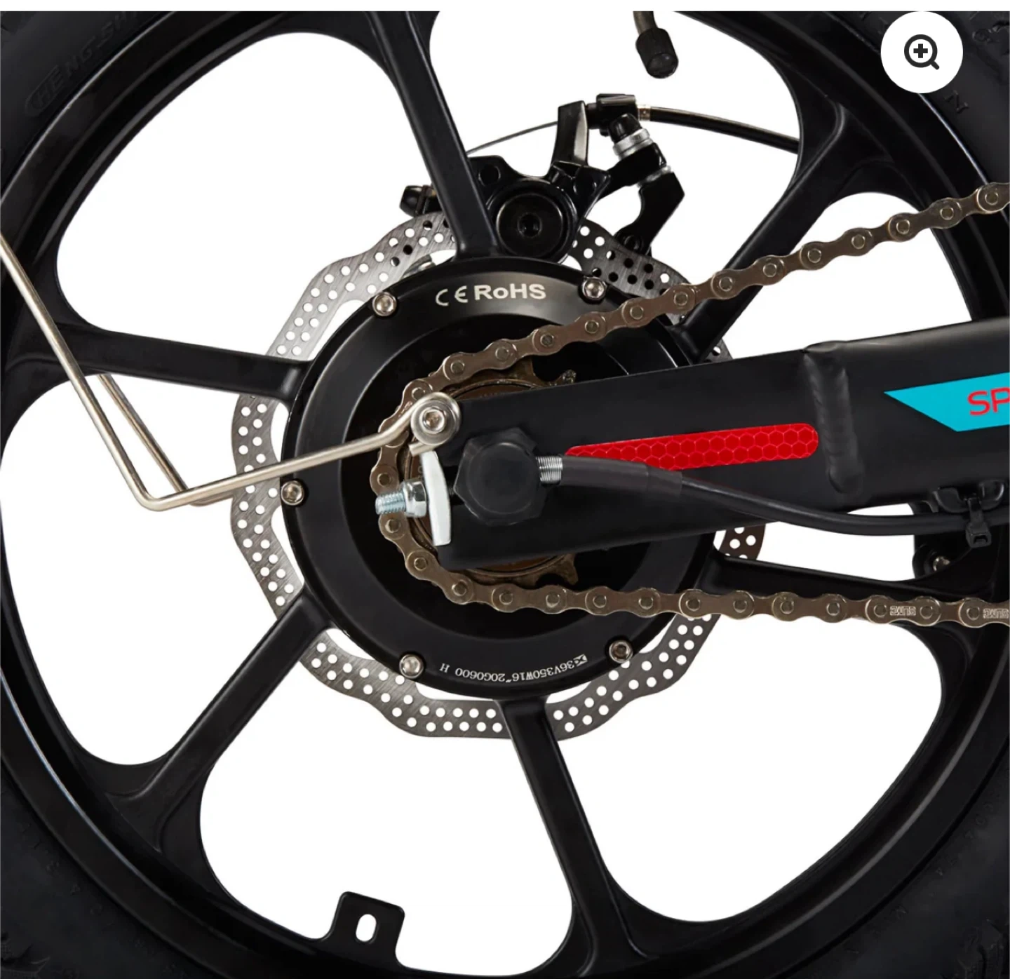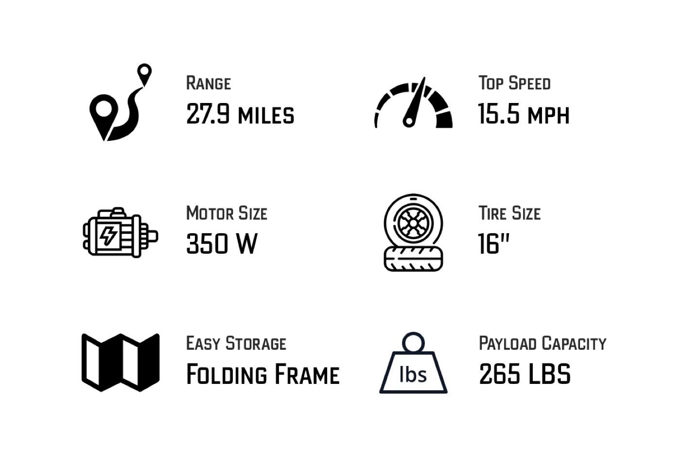 This GOTRAX EBE1 electric bike features a 350W motor and 16" tires. It has a 36V 7.5Ah battery offering up to 27.9 miles of range. The frame is aluminum alloy and it's a folding design for easy storage. Max payload is 265 lbs.