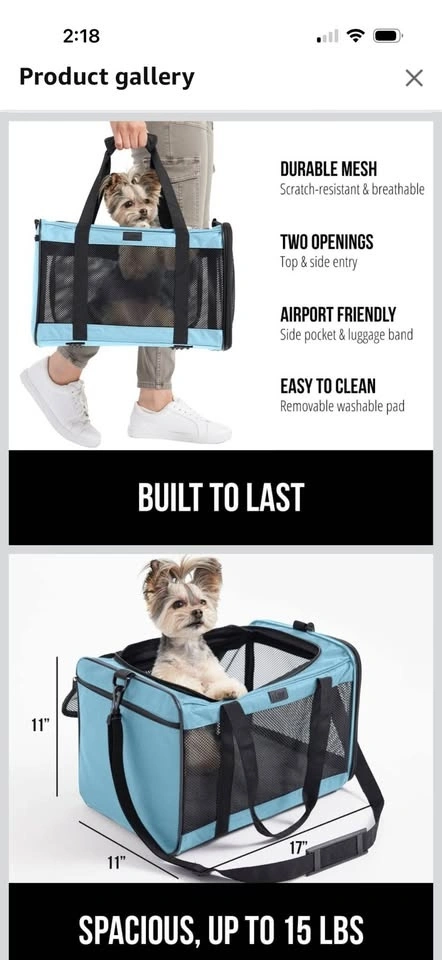 Brand new, still sealed! Medium size. Durable yet lightweight travel bag designed for convenient traveling with pets. Features two openings (top and side) for easy entry and exit, and a sturdy structured frame. Breathable mesh windows offer ventilation and visibility, and are scratch-resistant. Lightweight with padded handles and an adjustable strap for comfortable carrying. Includes a side pocket for travel documents and accessories, and a luggage band to attach to suitcases. Waterproof bottom with a removable and washable fleece pad insert. Measures 17x11x11 inches and supports pets up to 15 pounds. Compact size fits most planes, but please check with your airline to ensure it meets their specific requirements before travel.