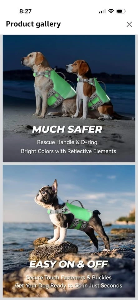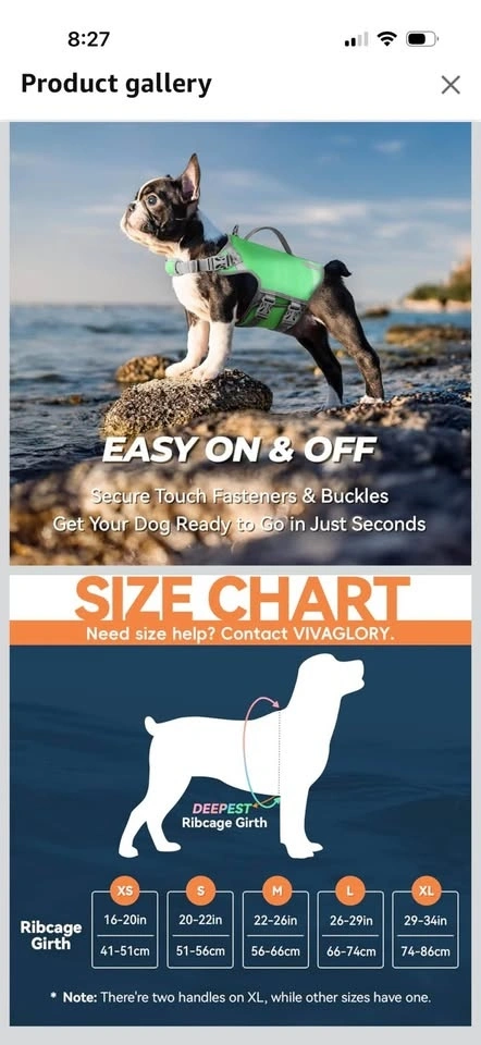 Brand new in sealed box! Large (size chart in photos). This VIVAGLORY dog life jacket has a neoprene outer layer and lining for superior comfort and extra warmth. It's designed for your dog’s freedom of movement, offering a secure fit without restriction and excellent durability. The wave-patterned print adds a fun summer swimming and beach feel. Thick buoyant foam filling in the neck, back, and sides ensures even flotation distribution, reducing fatigue and allowing your dog to move more freely and comfortably in the water. Great for boating, surfing, rafting, kayaking, or other water activities. The durable rescue handle allows you to quickly lift your dog out of the water in emergencies. The D-ring on the back is for leash attachment for better control. Reflective printing and bright colors enhance visibility in low-light conditions for added security. Neck and belly straps feature touch fasteners and quick-release buckles for easy on and off in seconds. Adjustable straps ensure a secure hold that won’t easily slip off. Let me know if you're interested!