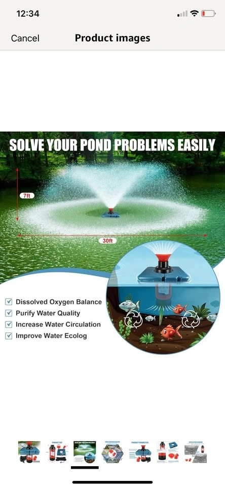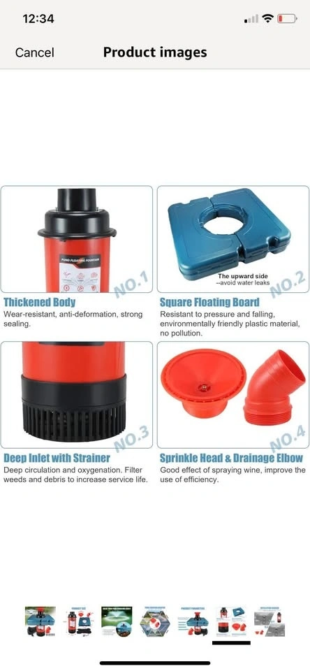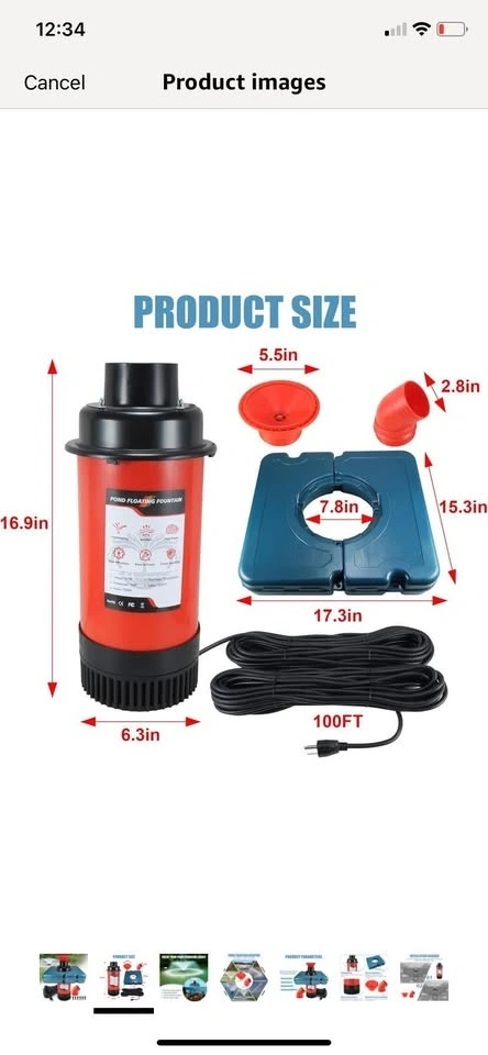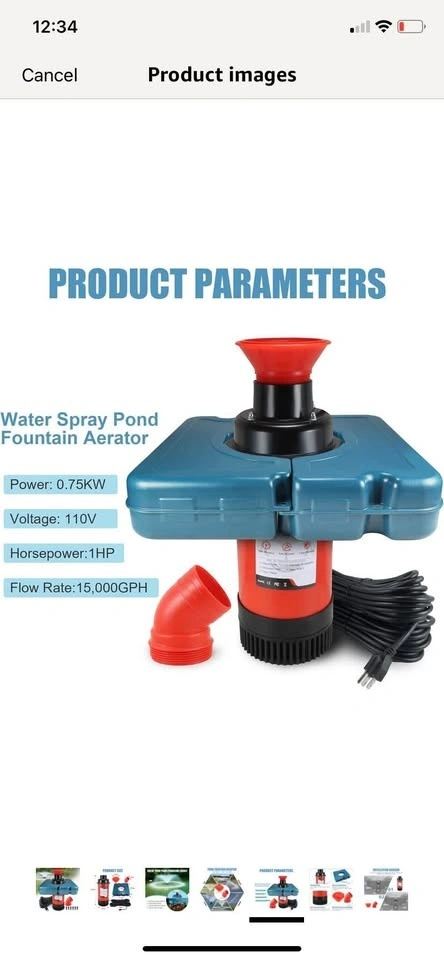 Brand new in box! This pond fountain oxygenator has two spray modes: V-shape and parabolic. It helps balance dissolved oxygen, purify water, and improve the pond's ecological environment. The main body is made of stainless steel, resistant to rust and high pressure. It comes with a 110V plug for easy setup and works in water up to 20 inches deep. The kit includes 2 metal ground stakes and 2 33-foot ropes. This energy-efficient, 750 watt, 1 hp stainless steel pump provides up to 15,000 gallons of water flow per hour.