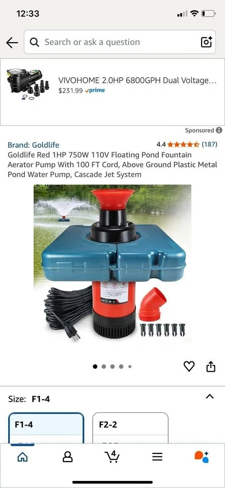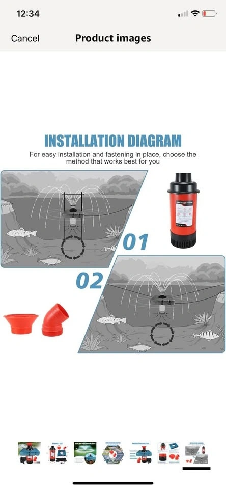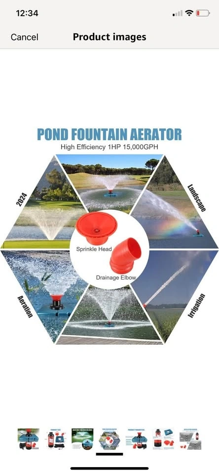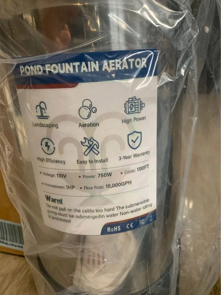 Brand new in box! This pond fountain oxygenator has two spray modes: V-shape and parabolic. It helps balance dissolved oxygen, purify water, and improve the pond's ecological environment. The main body is made of stainless steel, resistant to rust and high pressure. It comes with a 110V plug for easy setup and works in water up to 20 inches deep. The kit includes 2 metal ground stakes and 2 33-foot ropes. This energy-efficient, 750 watt, 1 hp stainless steel pump provides up to 15,000 gallons of water flow per hour.