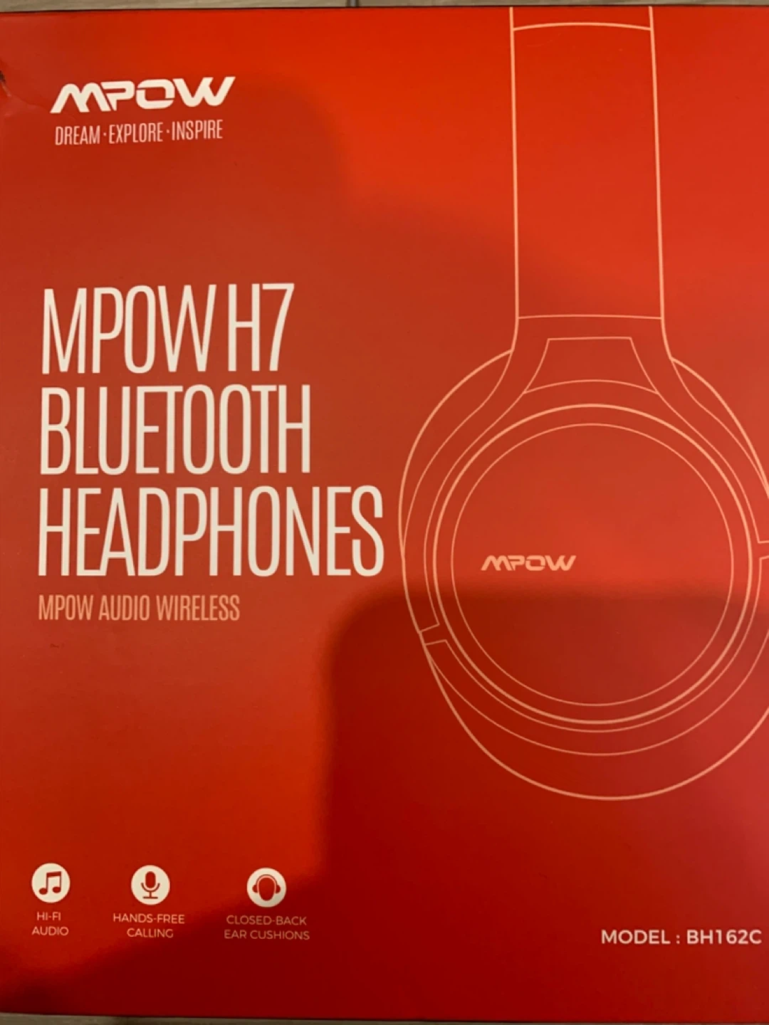 MPOW H7 Bluetooth headphones with Hi-Fi audio. These headphones feature hands-free calling and closed-back ear cushions for a better listening experience. Model BH162C.