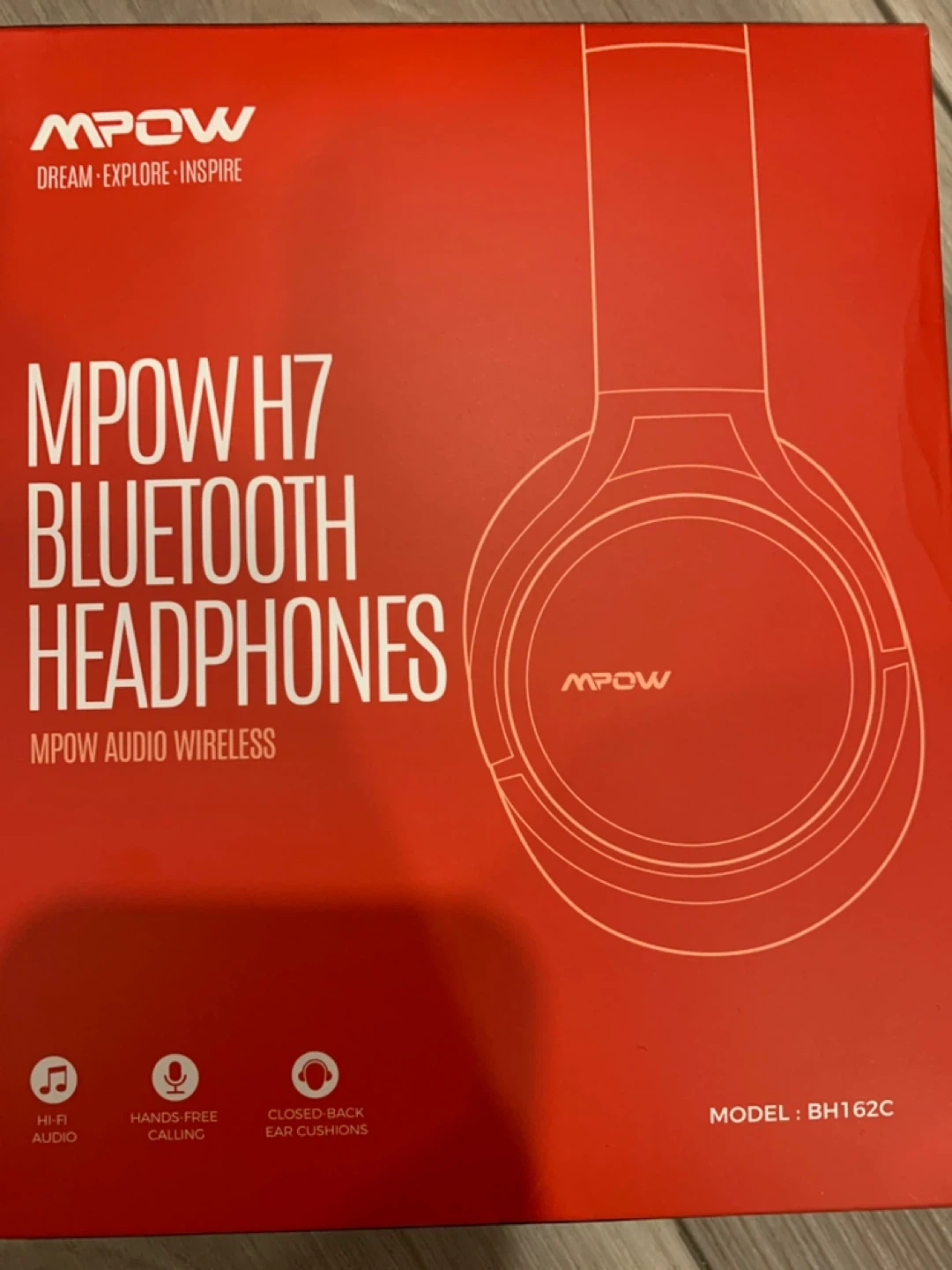 MPOW H7 Bluetooth headphones with Hi-Fi audio. These headphones feature hands-free calling and closed-back ear cushions for a better listening experience. Model BH162C.