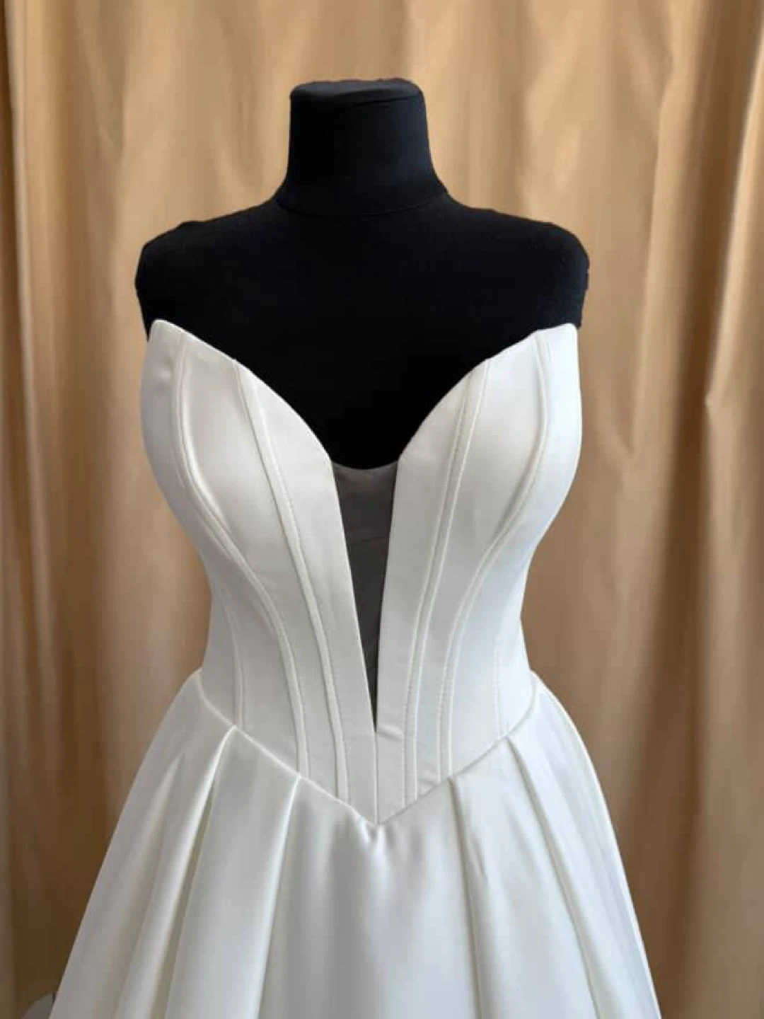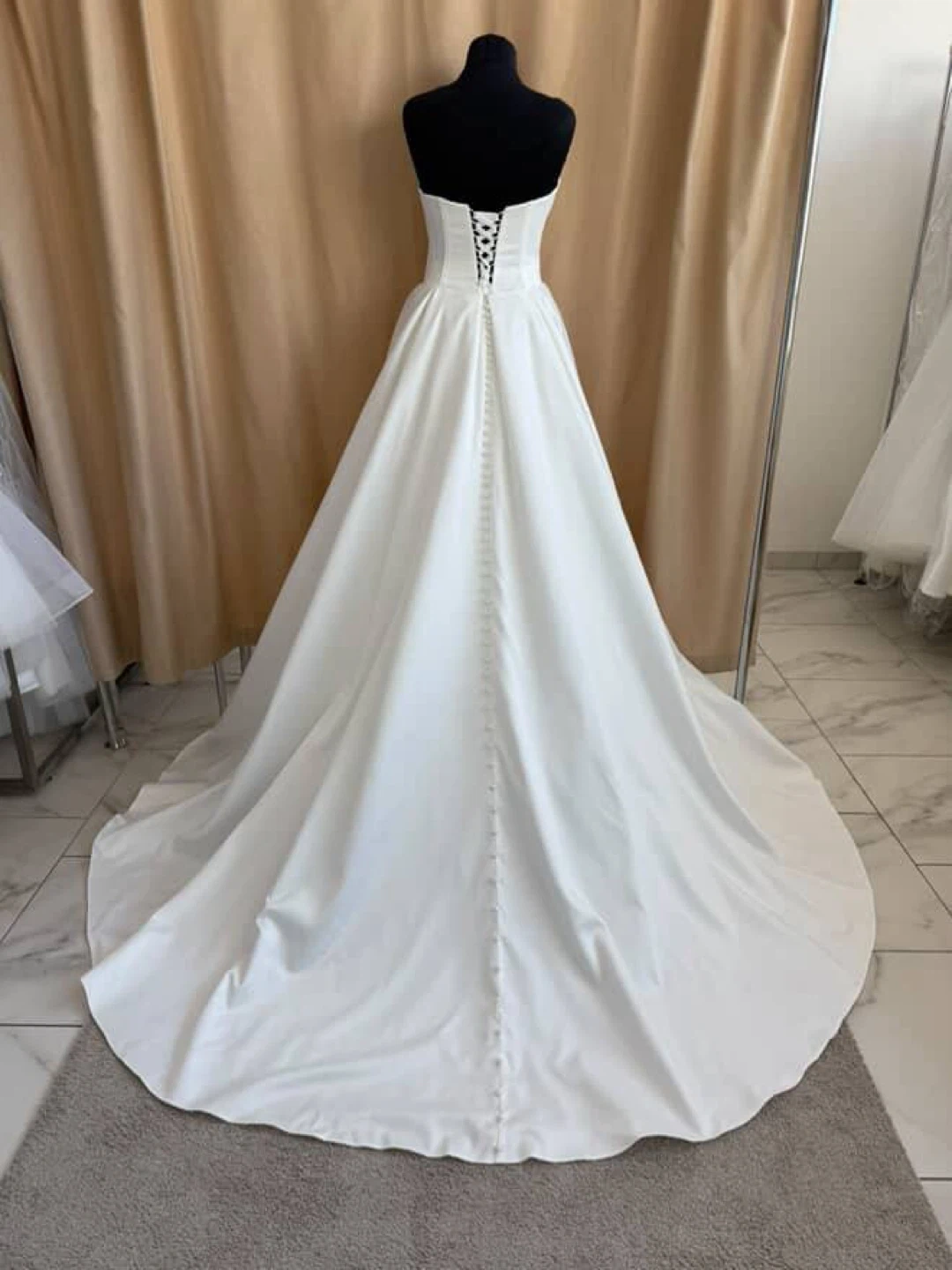 The dress is made of high-quality satin with an elegant structured corset and a convenient bustle for lifting the train.
