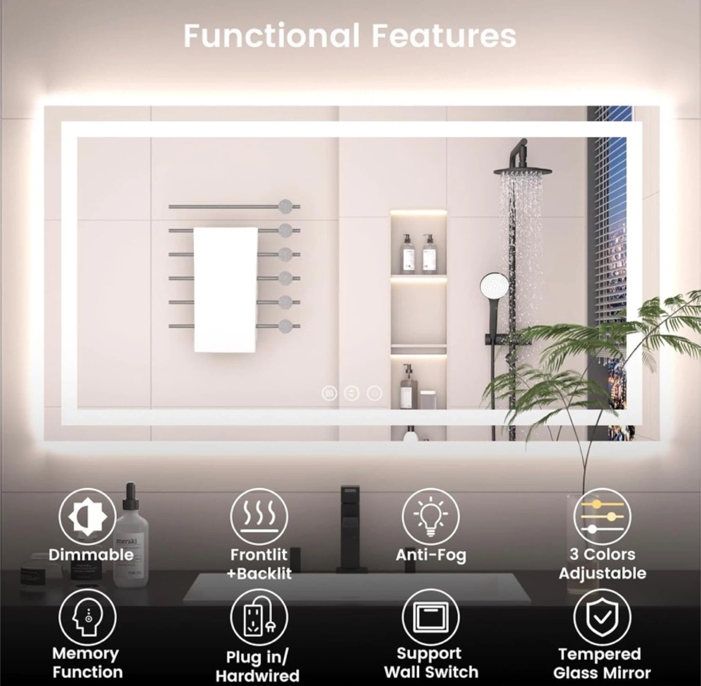 30"x30"Rectangle LED Bathroom Mirror with Lights, 3 Color, Anti-Fog, Frameless Wall-Mounted Mirror with Backlit + Front Lit, Stepless Dimmable