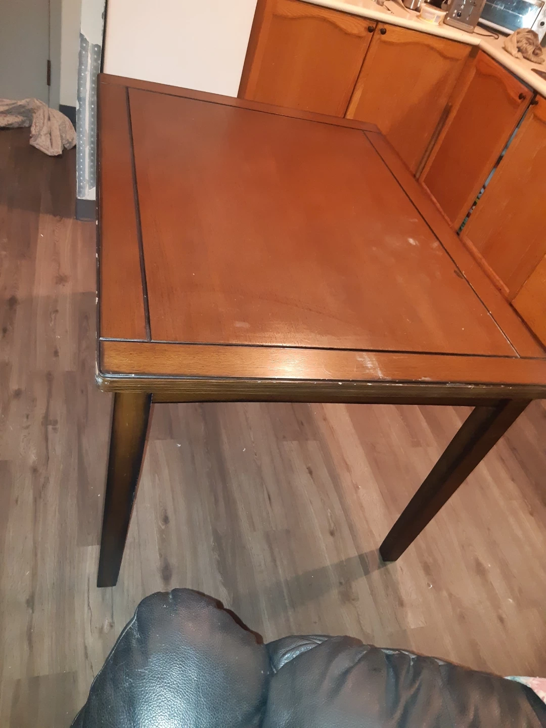 A sturdy wooden dining table with a dark brown finish. This table's simple design fits well in most kitchens or dining areas. It's a good size for smaller gatherings.