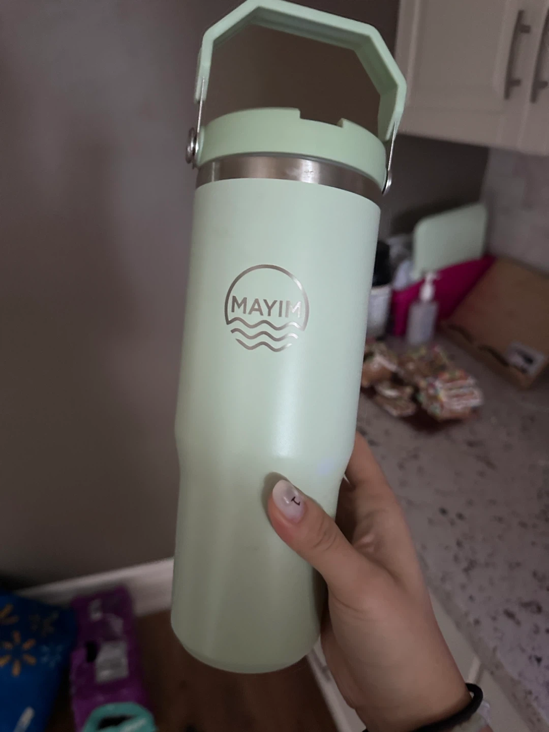 This is a MAYIM brand tumbler with a convenient handle. It's a reusable cup, perfect for keeping your drinks hot or cold on the go. Its light green colour makes it easy to spot!