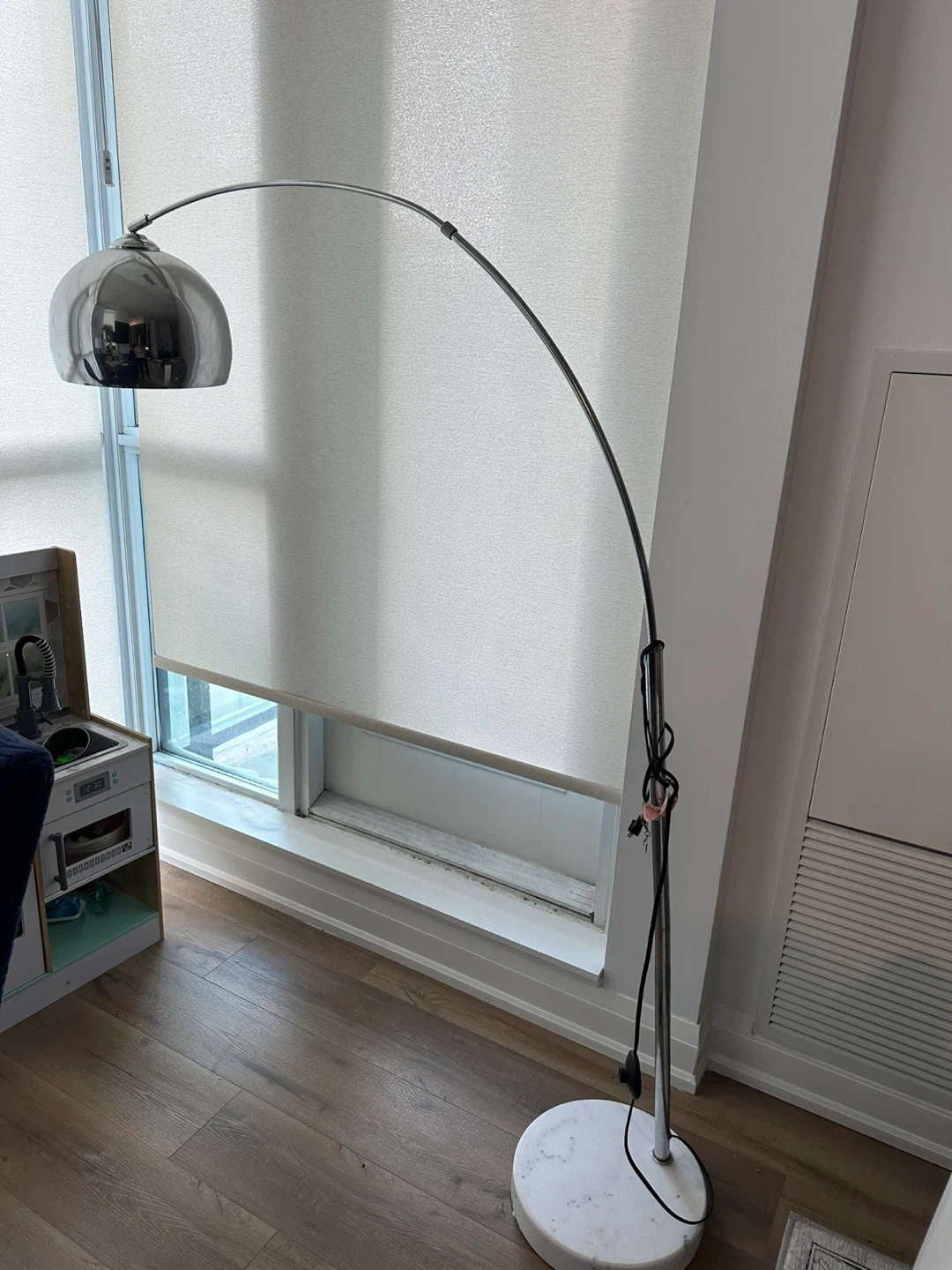A modern arc floor lamp with a polished metal dome shade. Its sleek design complements various decor styles. The lamp has a sturdy marble base and on/off foot switch, so proximity to an outlet isn't an issue. It's a great addition for reading books or living spaces, bedroom!