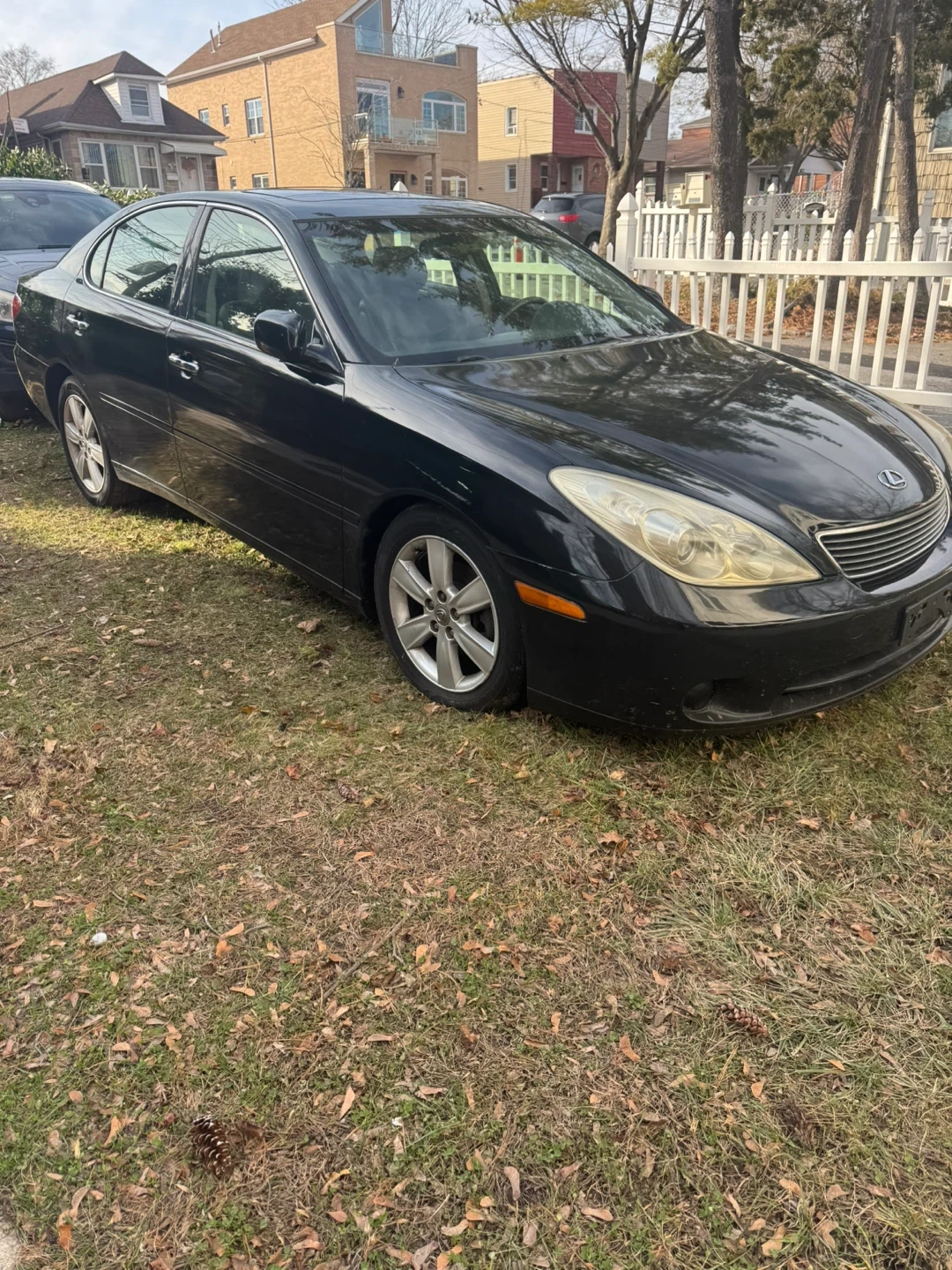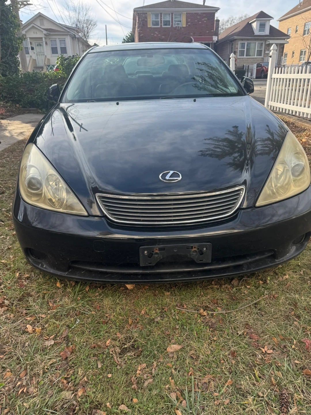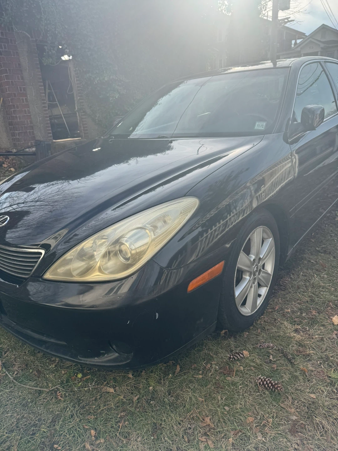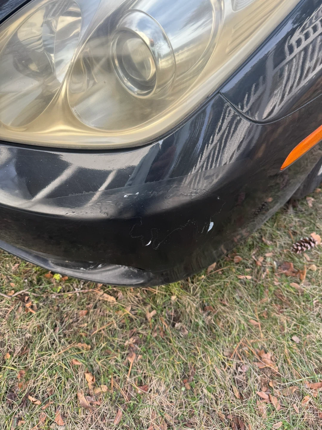 This is a black Lexus sedan. It's a four-door car. There's minor cosmetic damage on the front bumper.