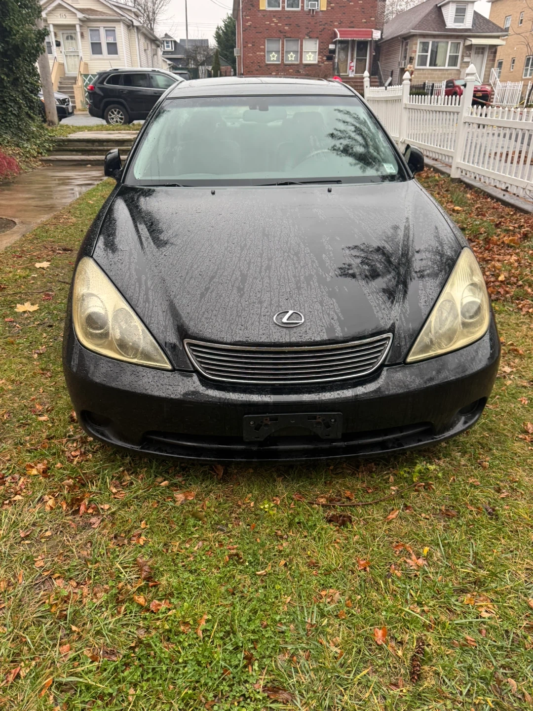 This is a black Lexus sedan. It's a four-door car. There's minor cosmetic damage on the front bumper.