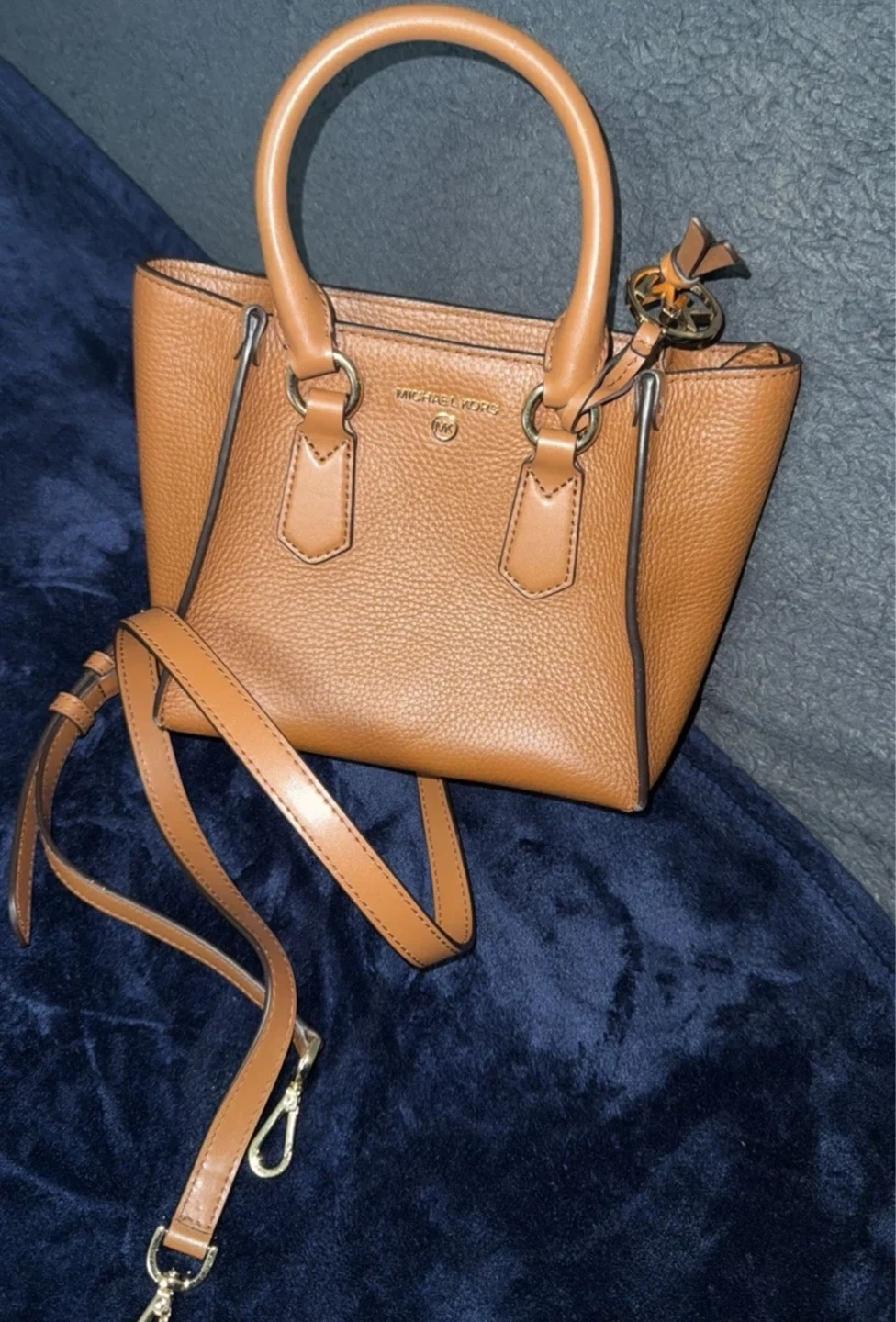 This is a Michael Kors satchel handbag in a rich brown pebbled leather. It's a versatile size and comes with a detachable crossbody strap. The interior is lined with the Michael Kors logo pattern.