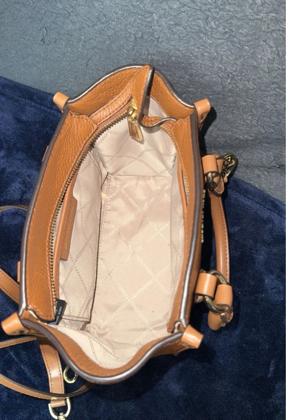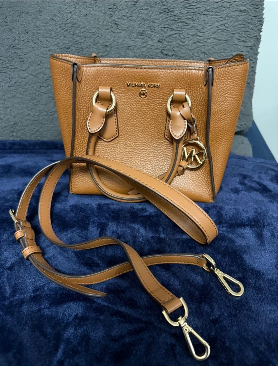 This is a Michael Kors satchel handbag in a rich brown pebbled leather. It's a versatile size and comes with a detachable crossbody strap. The interior is lined with the Michael Kors logo pattern.