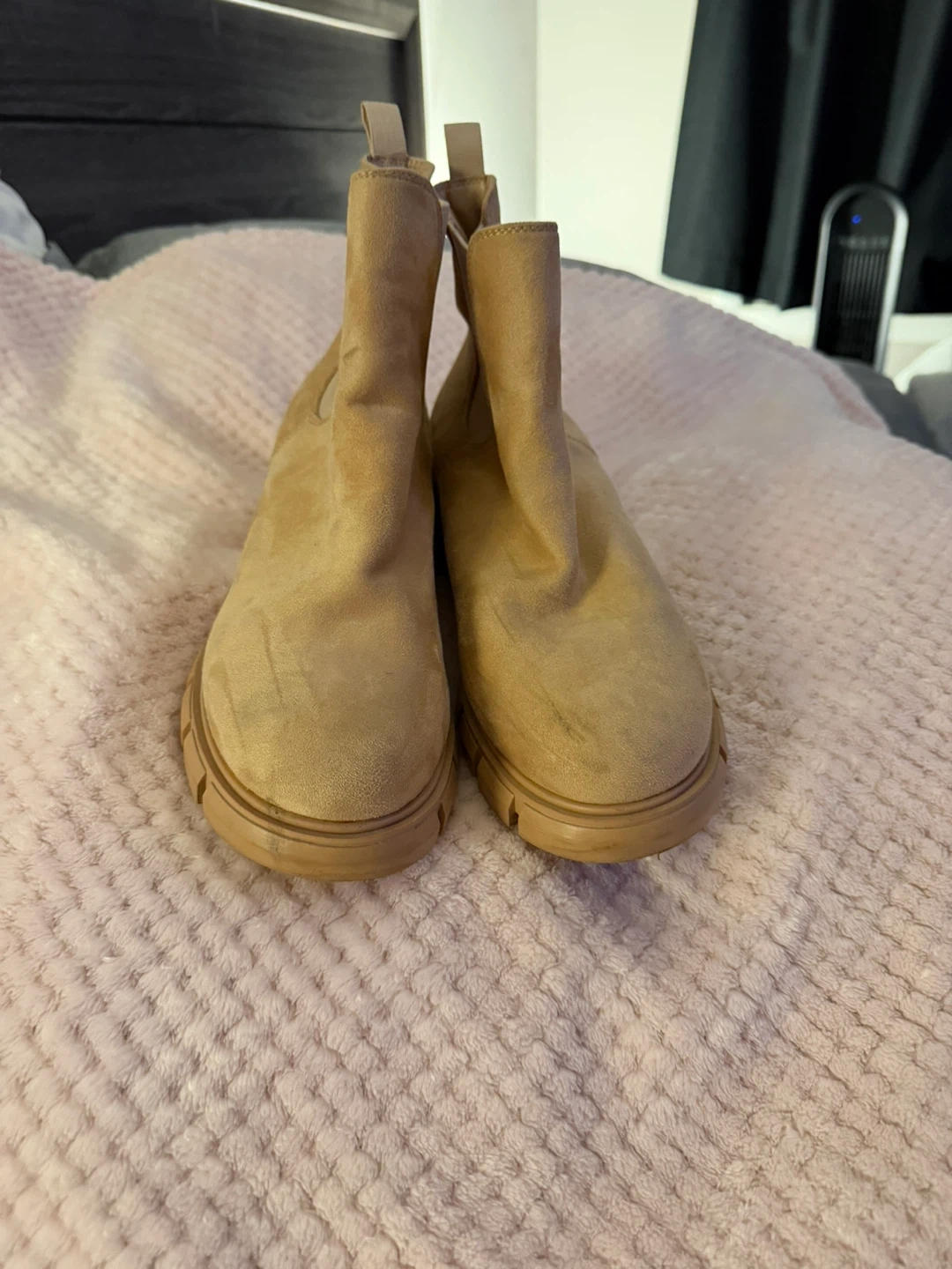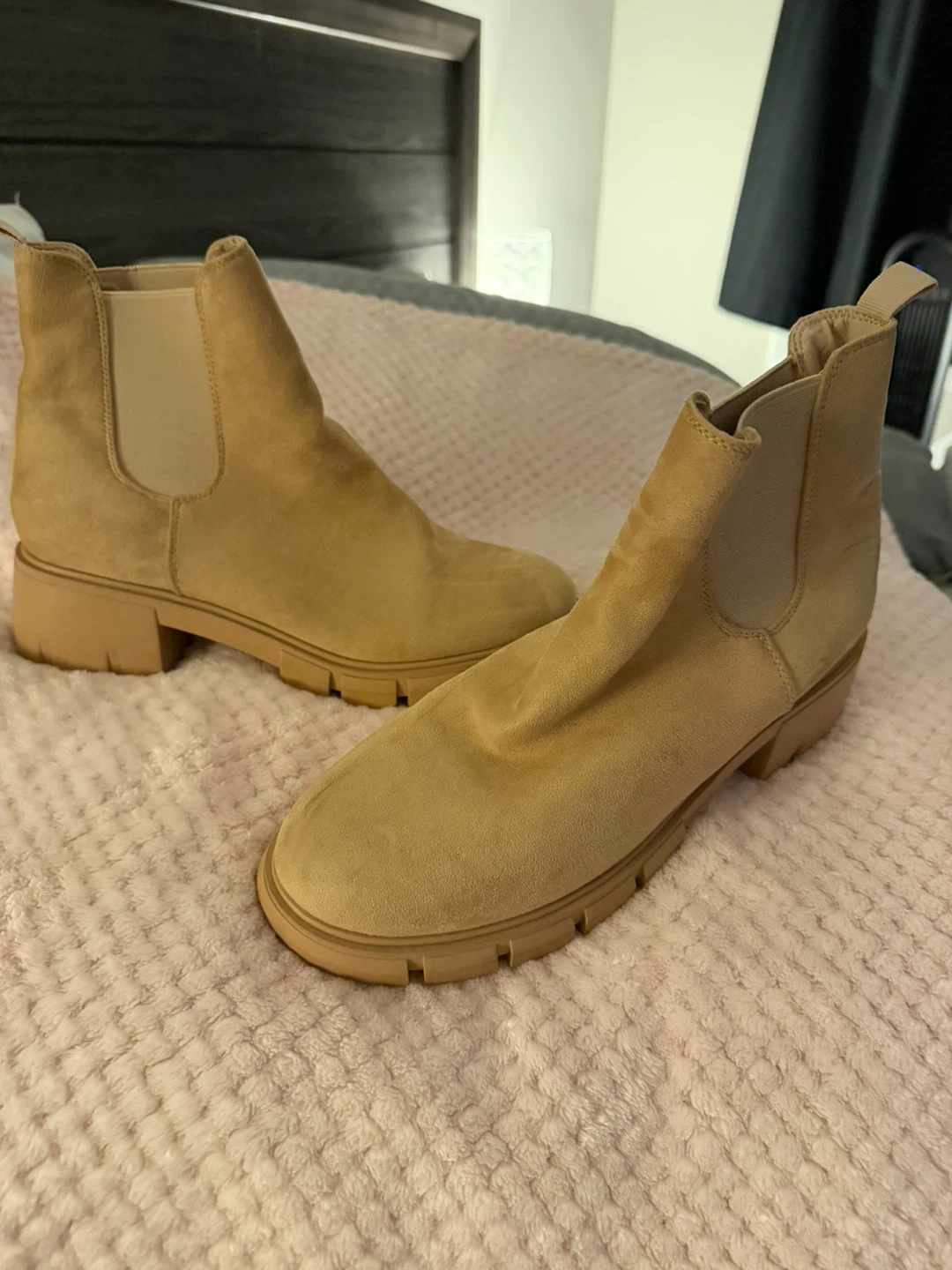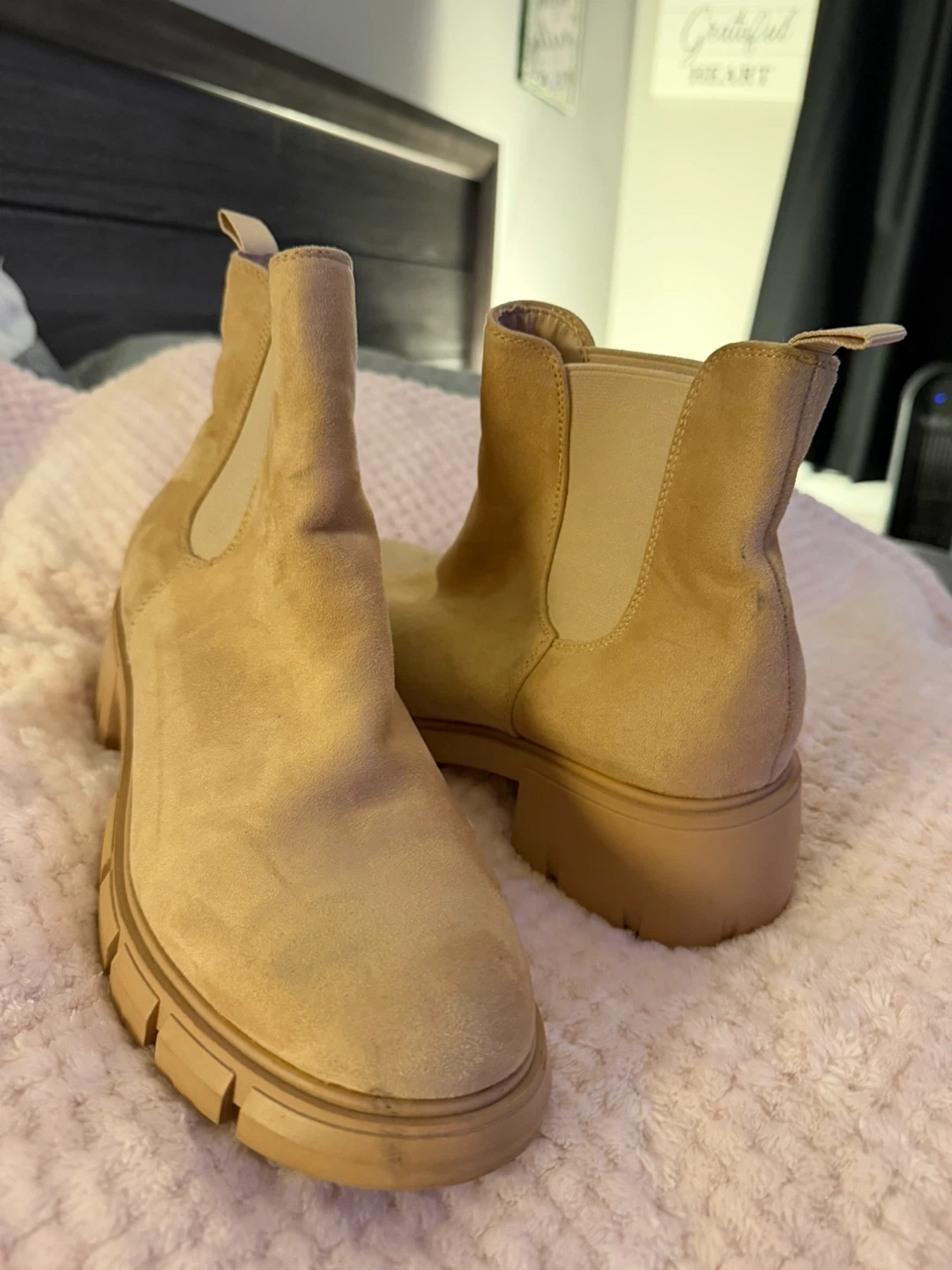 Tan suede Chelsea boots with elastic side panels and a chunky lug sole. The boots have a heel height of approximately 2 inches. Pull tabs at the back for easy on and off.