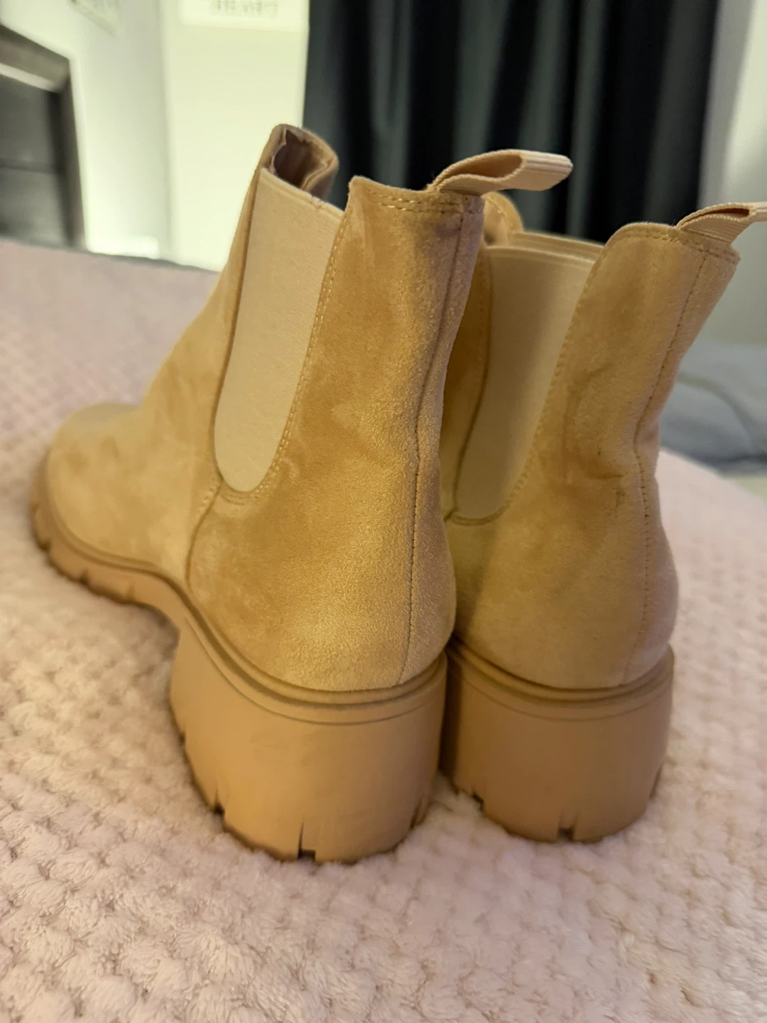 Tan suede Chelsea boots with elastic side panels and a chunky lug sole. The boots have a heel height of approximately 2 inches. Pull tabs at the back for easy on and off.