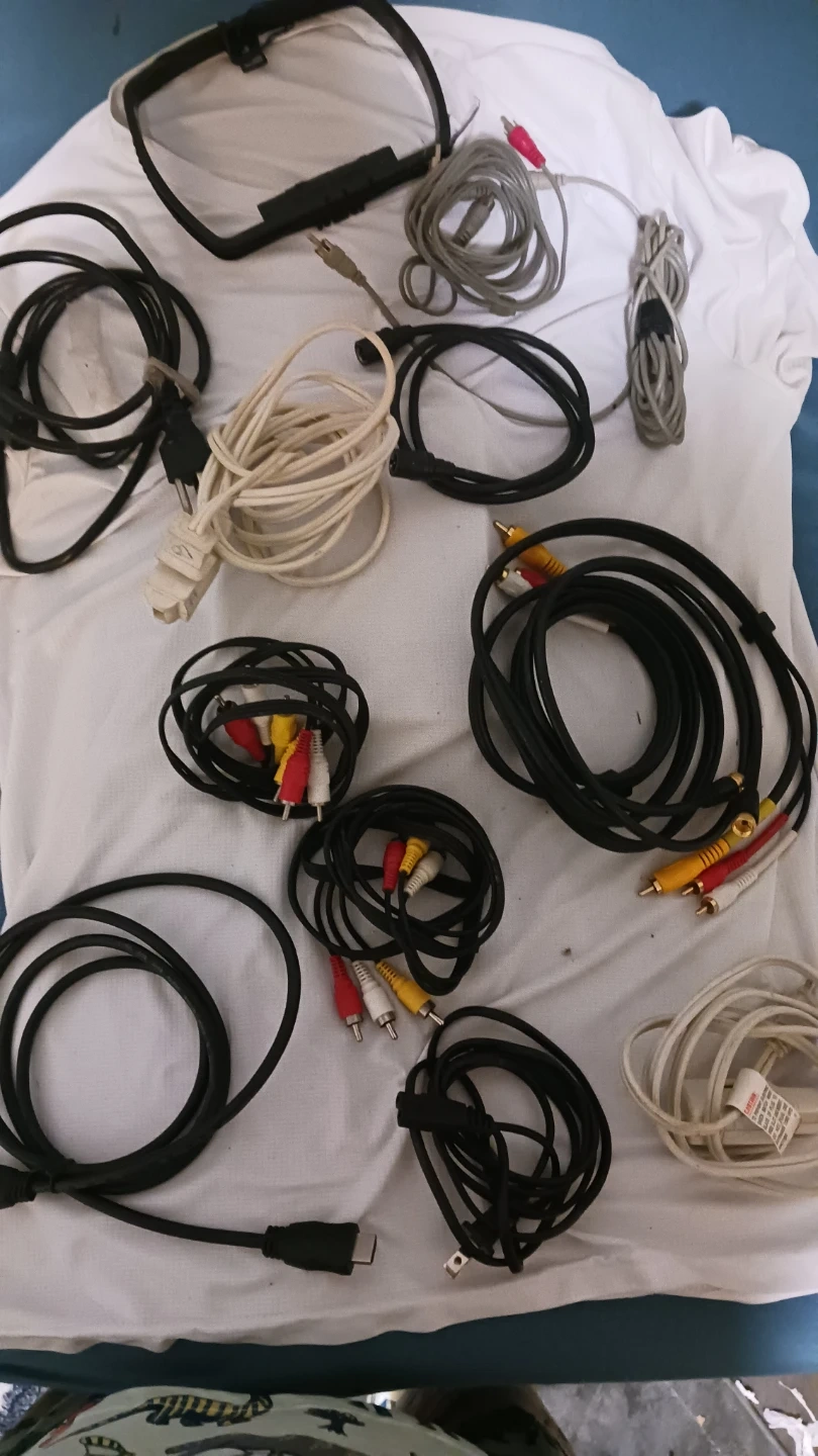 A collection of various audio and video cables. It includes RCA composite cables, a USB-C cable, and power cables. These are useful for connecting different electronic devices.