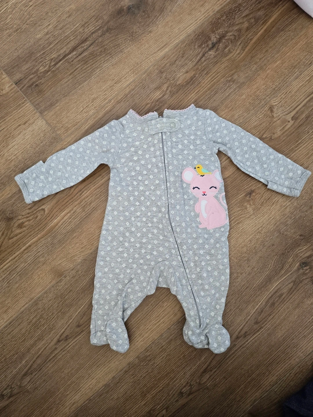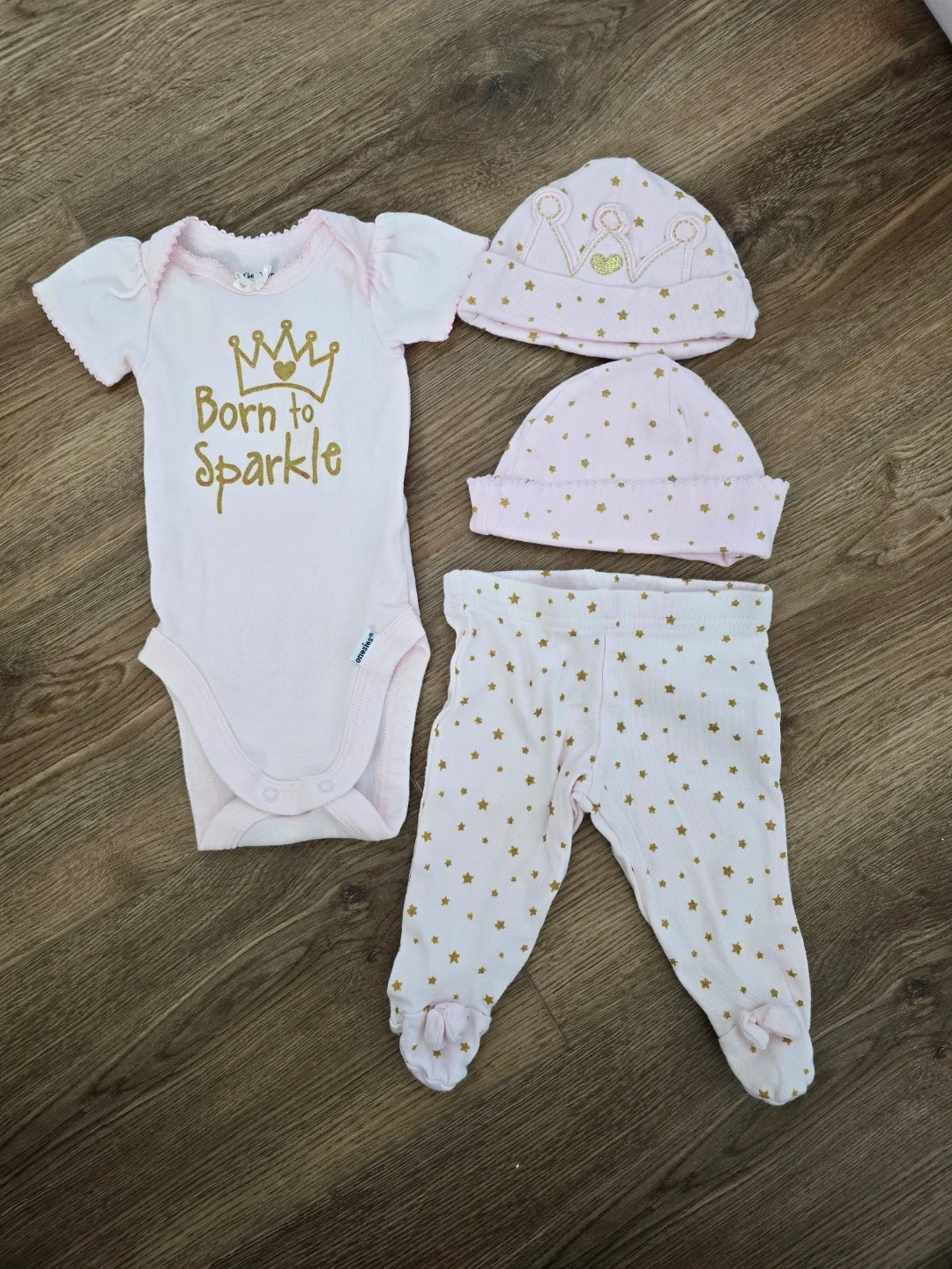This newborn bundle includes a variety of baby girl outfits that are gently used. You'll find a red buffalo check dress with bloomers, a white onesie and denim pants set, a grey bunny long-sleeve onesie, a pink "Born to Sparkle" onesie with pants and two hats, a hedgehog print long-sleeve onesie with pink striped pants, hats, socks, mitts, as well as an aden + anais sleep sack. Perfect for dressing up your little one!