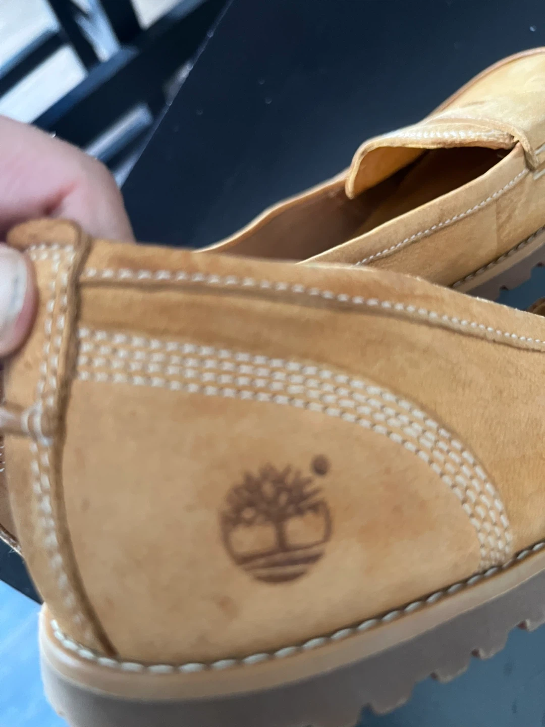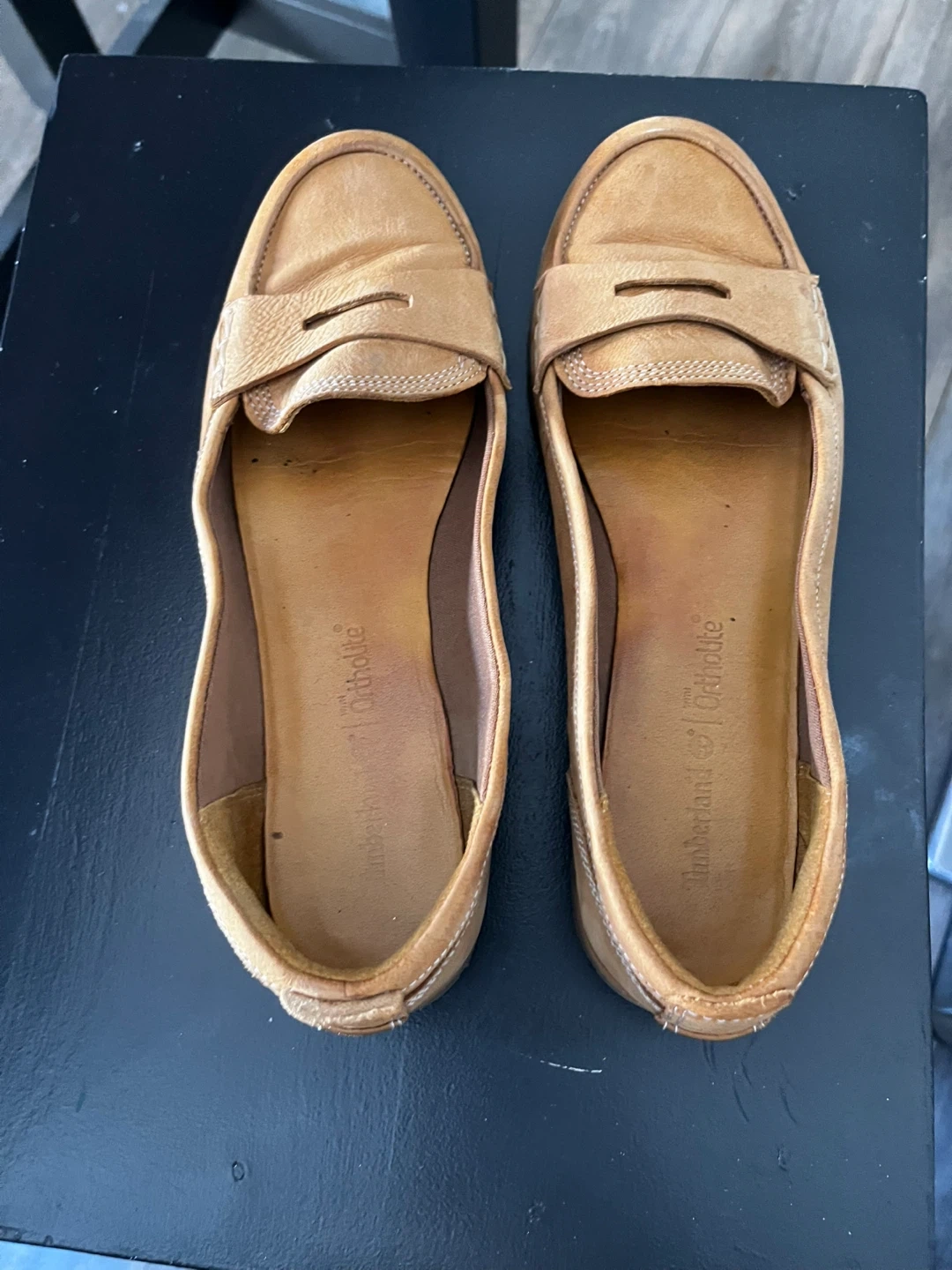 Women’s size 8.5 Timberland loafers feature a classic design with stitched detailing. They're made with OrthoLite insoles for comfort. Suede material.