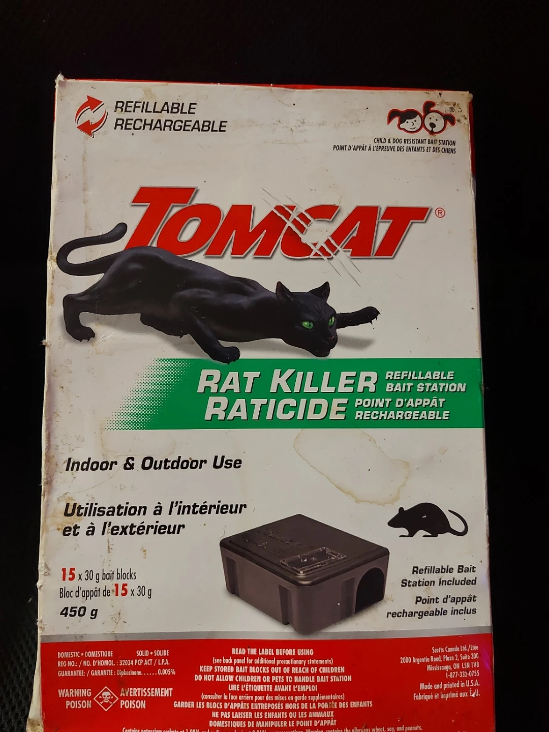 This Tomcat rat killer includes a refillable bait station for indoor and outdoor use. It contains 15 x 30 g bait blocks, totaling 450 g. The station is designed to be rechargeable for ongoing pest control.