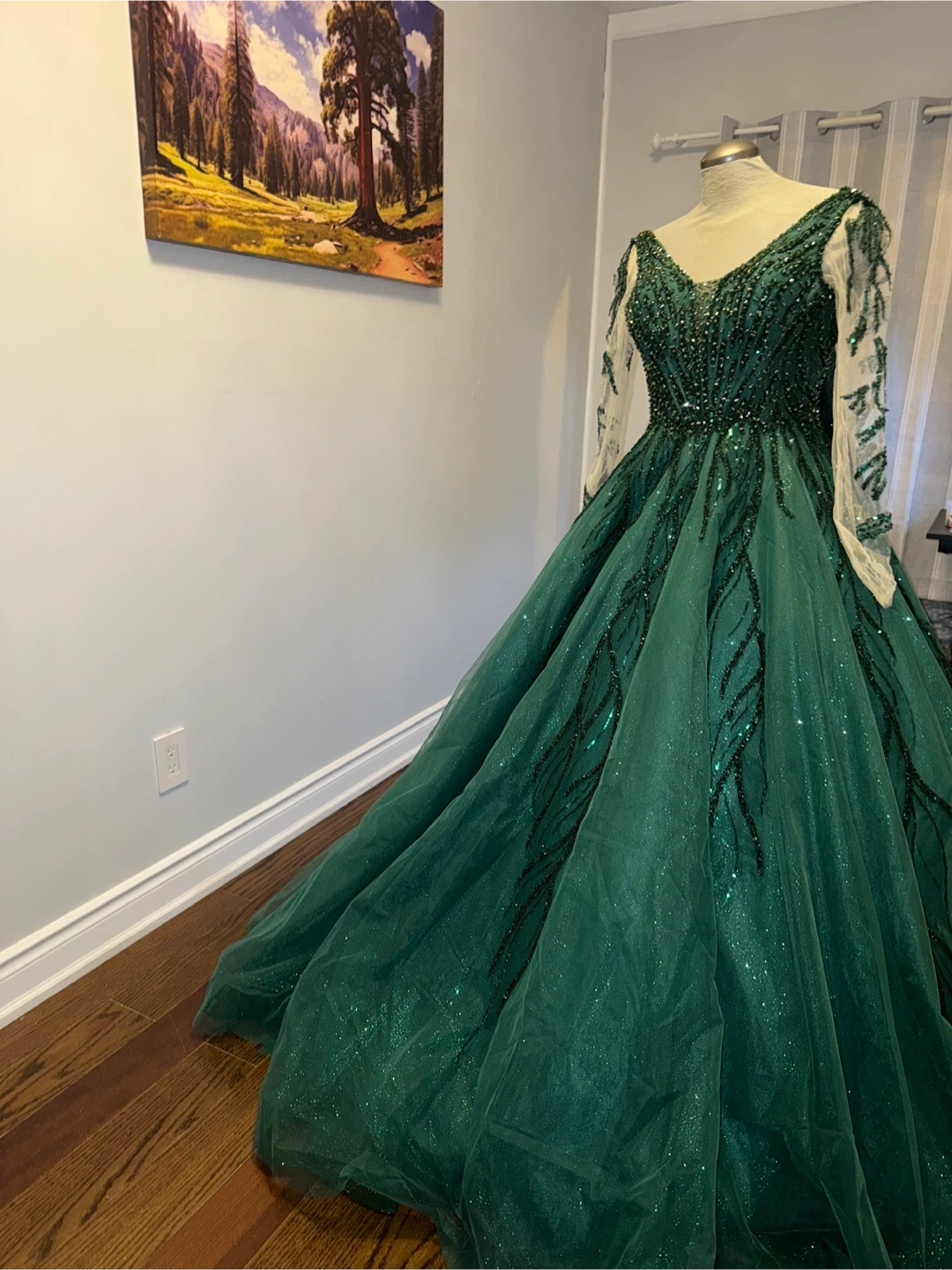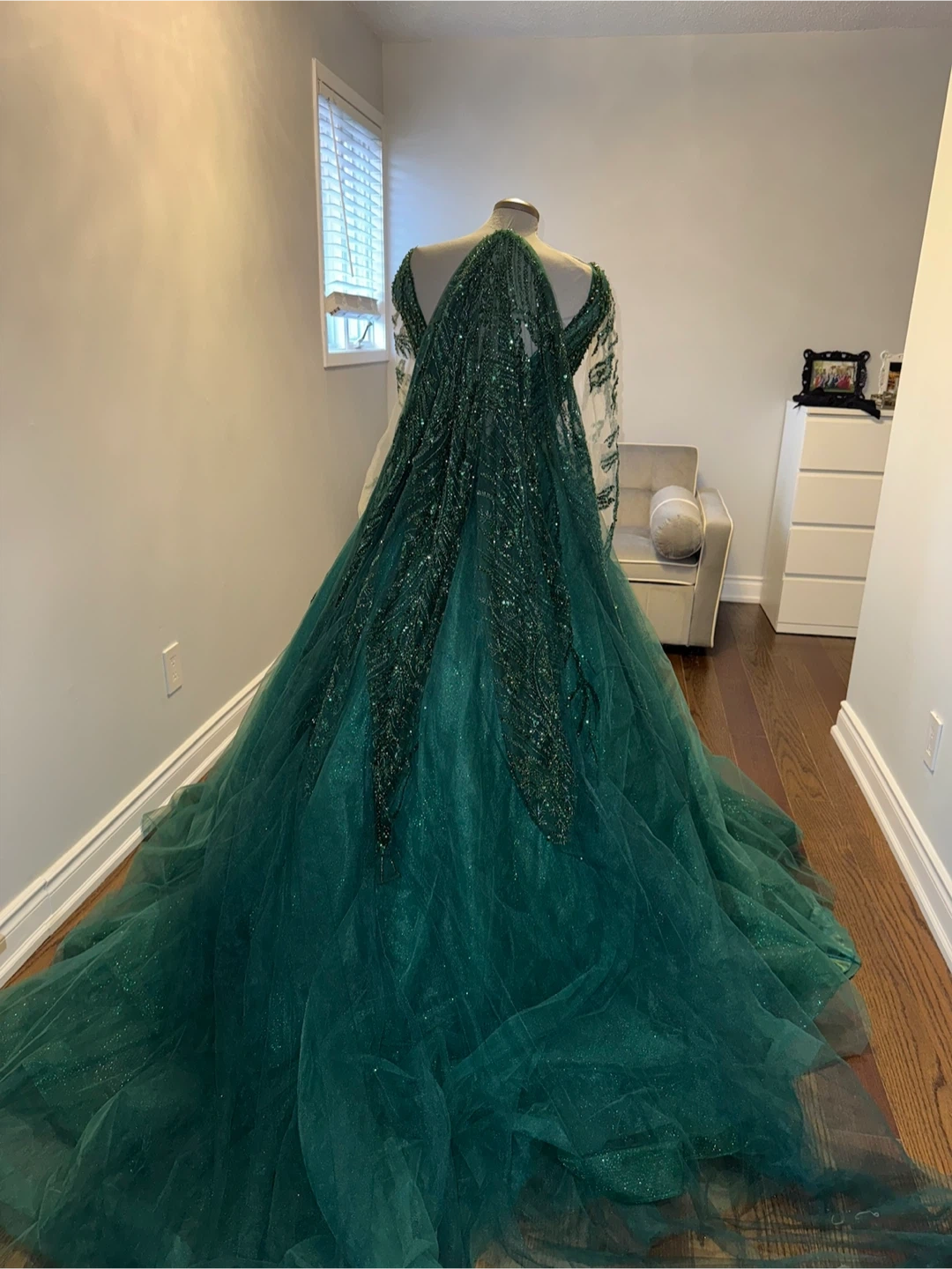 Selling this brand new green afghan nikkah dress as i am no longer doing a big banquet wedding. dress is brand new, all tags are attached. includes veil as well. message me for more vids/pics.