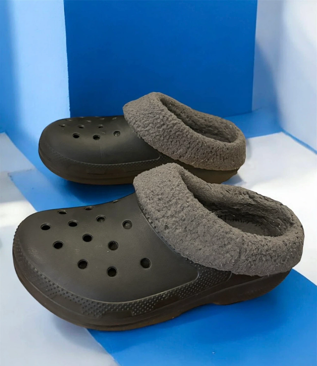Used Crocs Classic Lined Clogs are black with a cozy gray fuzzy lining. They're a size 8 in women's or 6 in men's. The Croslite material offers lightweight cushioning and comfort.