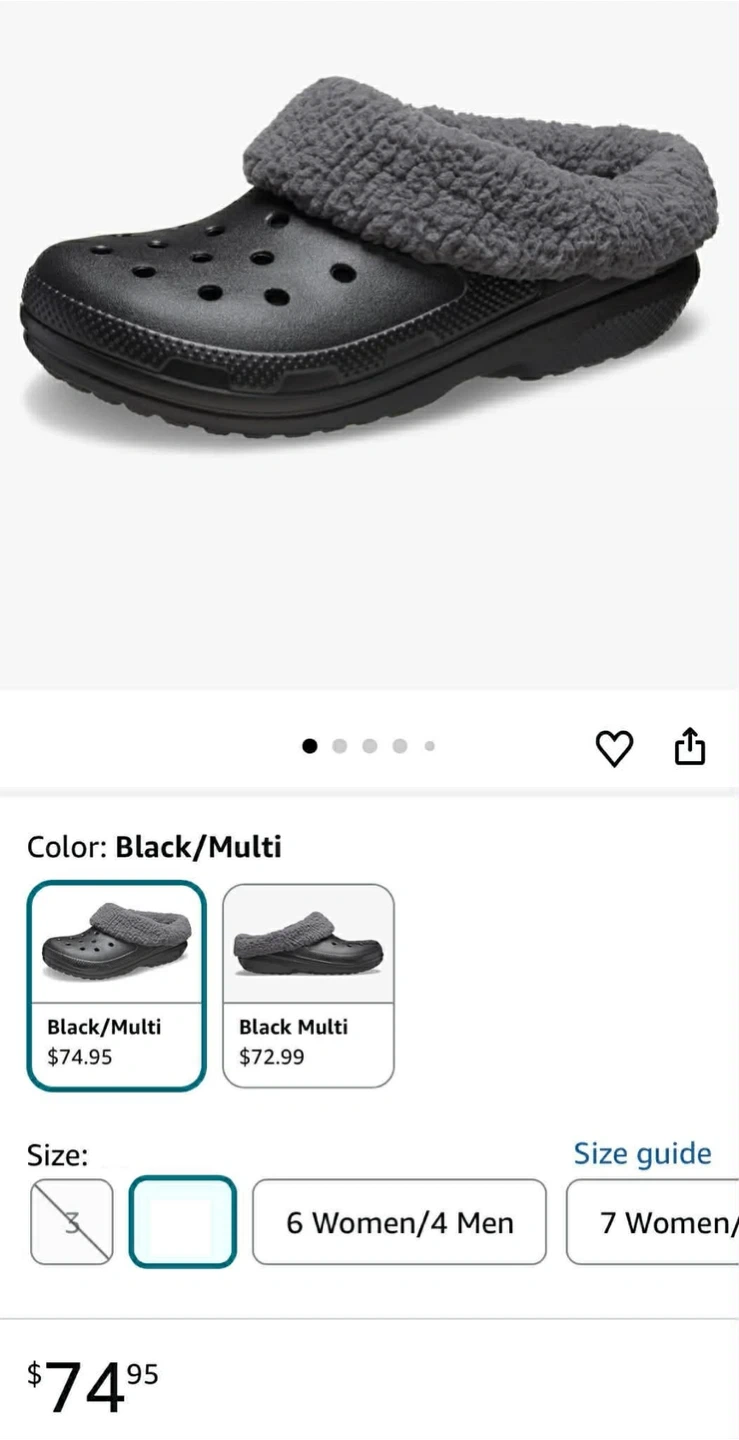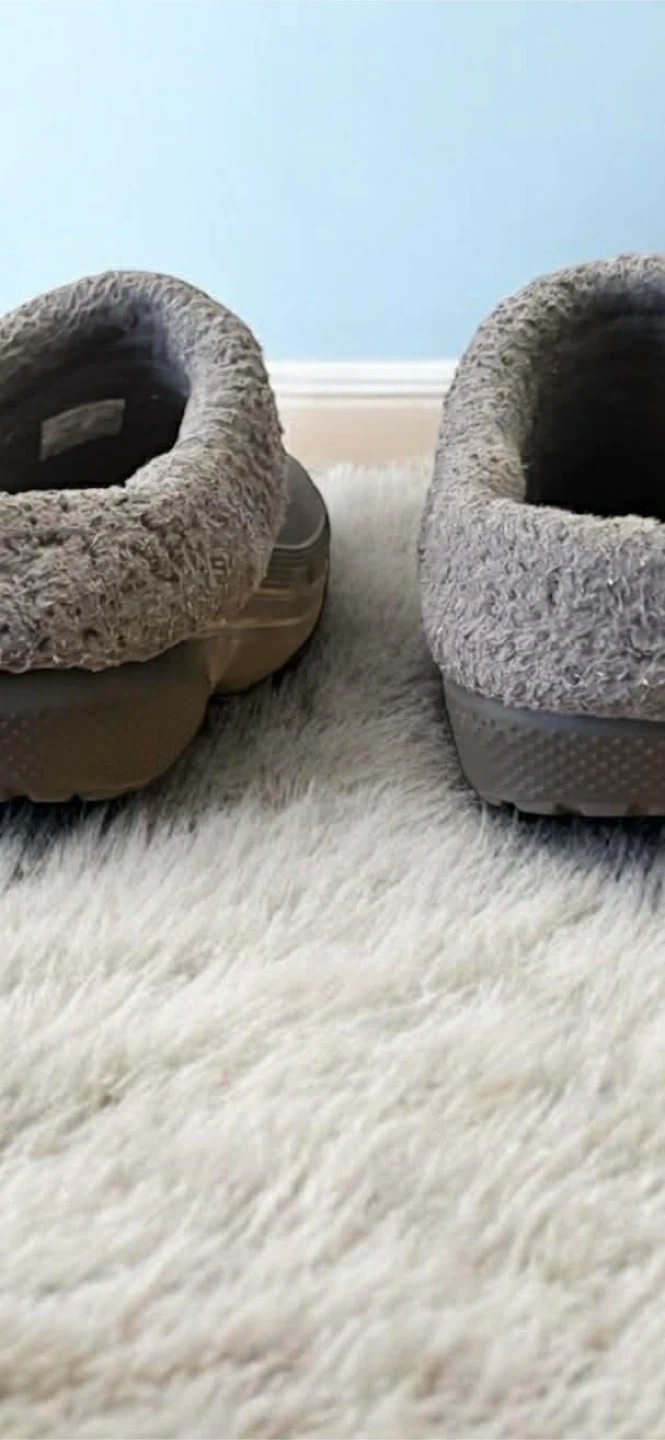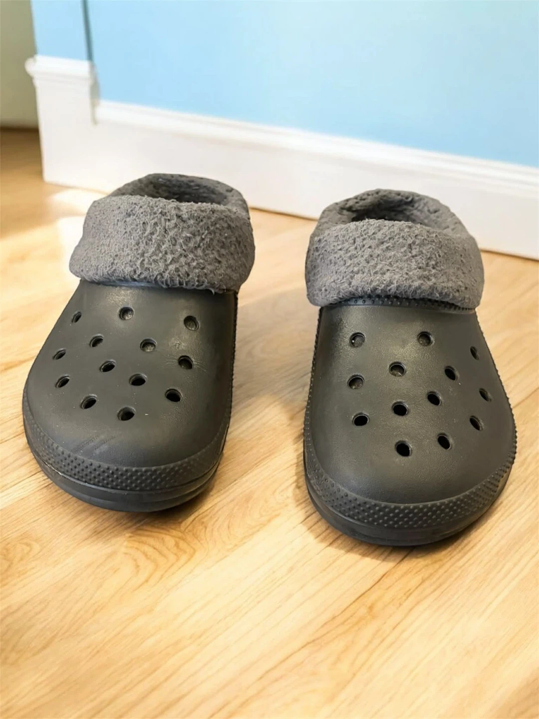 Used Crocs Classic Lined Clogs are black with a cozy gray fuzzy lining. They're a size 8 in women's or 6 in men's. The Croslite material offers lightweight cushioning and comfort.
