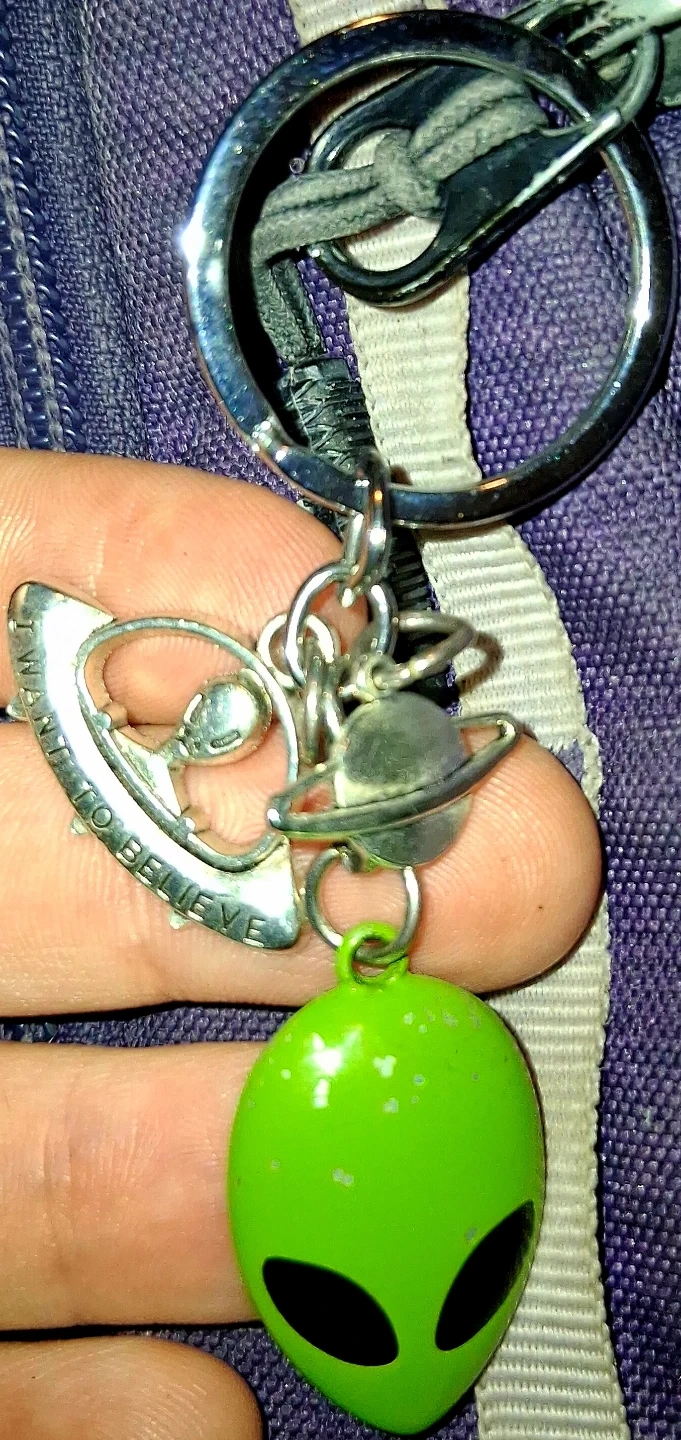 This keychain features a shiny silver tone with an alien head charm and a planet charm. Text on the silver piece reads 'I WANT TO BELIEVE'. It's a fun accessory for anyone who loves space and the unknown! Pick up only unless near intersection of Oxford and Gammage Street.