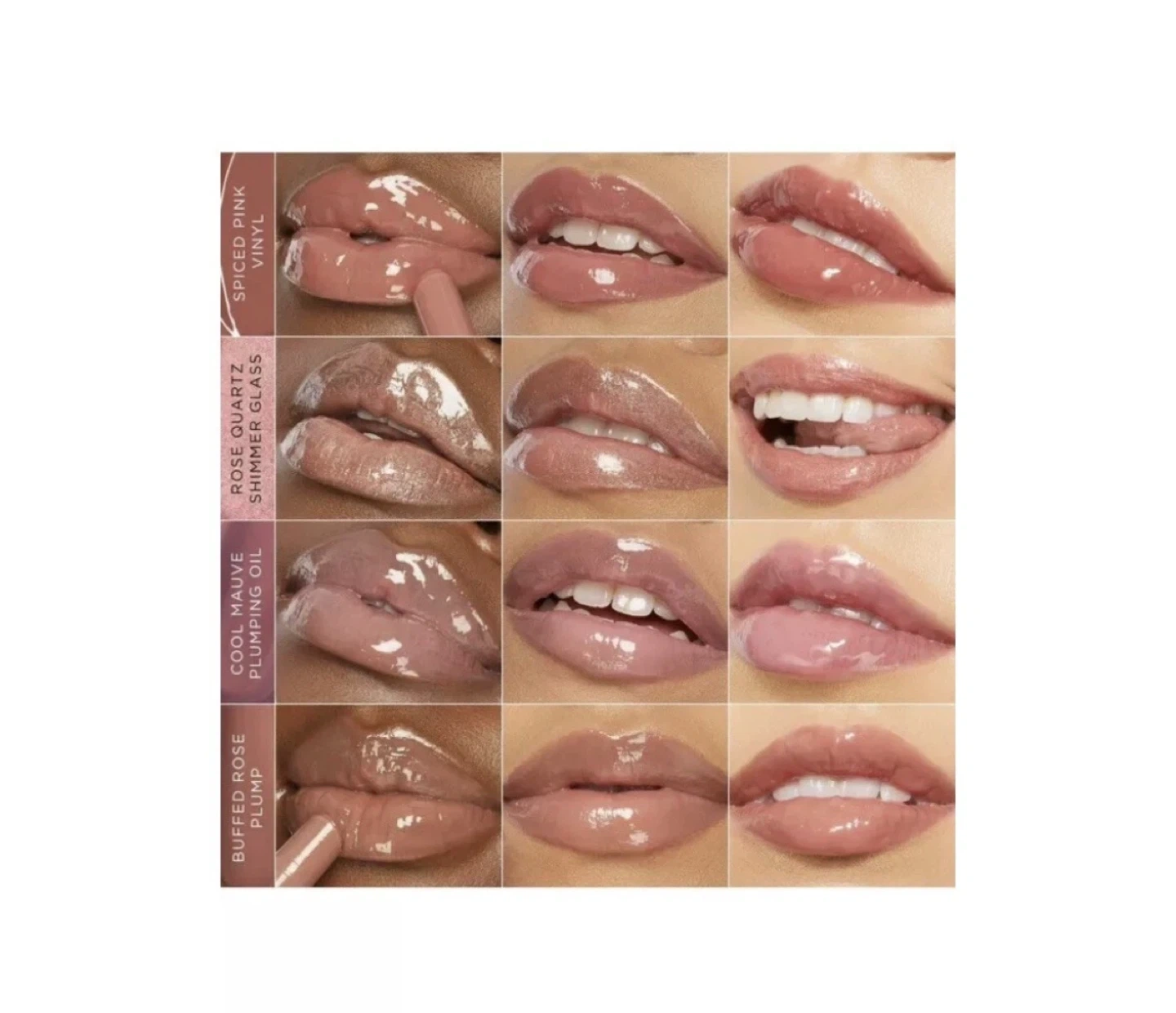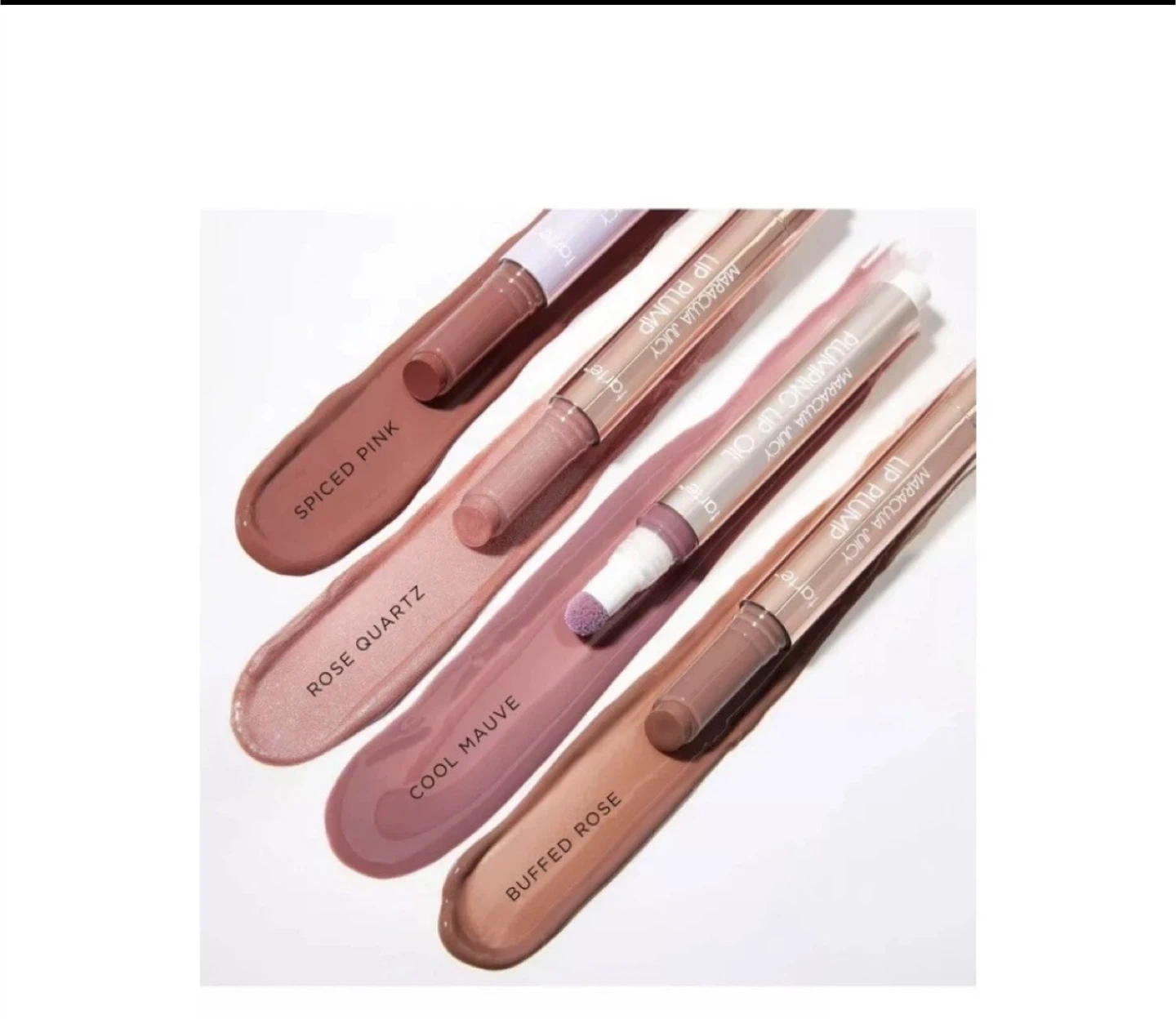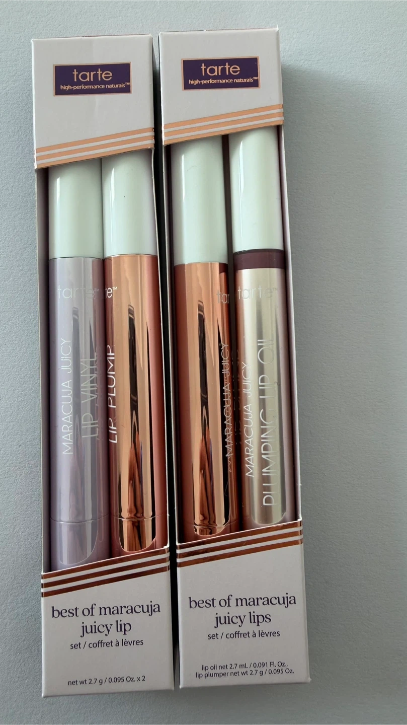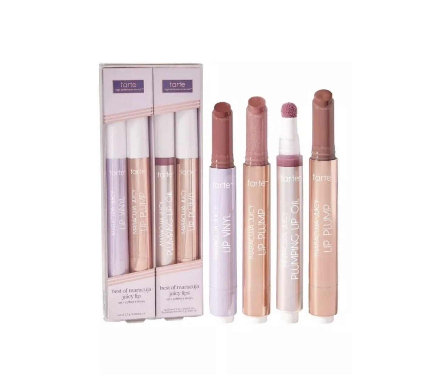 Tarte Maracuja Juicy Lip Vinyl, Lip Plump, and Plumping Lip Oil set. Contains four shades: Spiced Pink, Rose Quartz, Cool Mauve, and Buffed Rose. Net weight 2.7 g / 0.095 oz. x 2.
