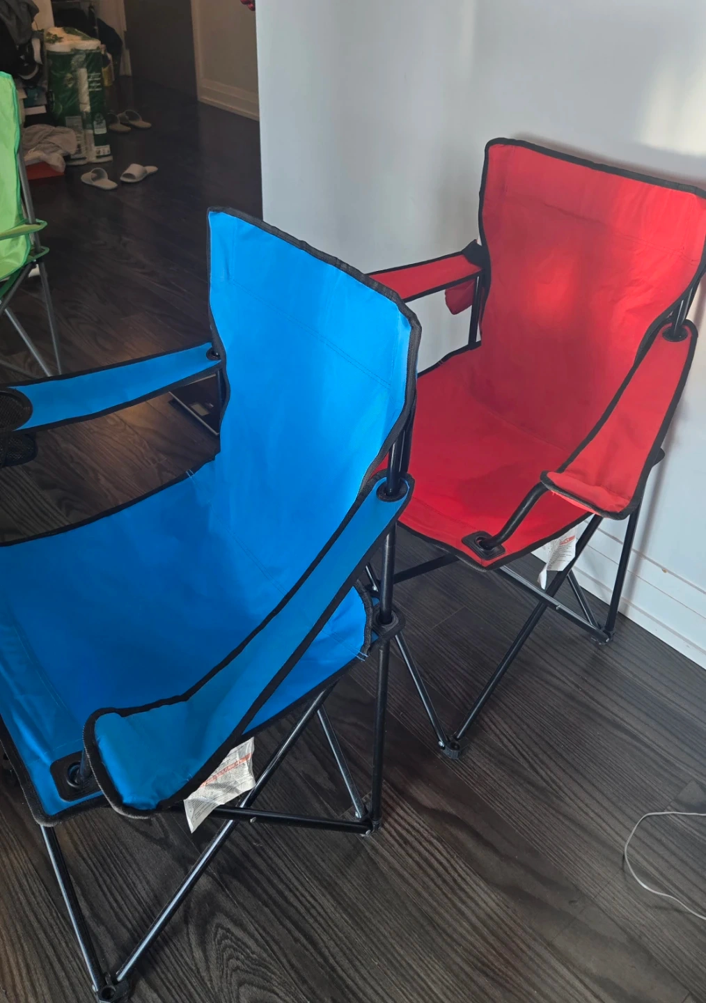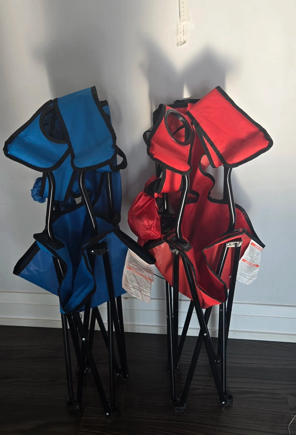 Two portable folding camping chairs, one blue and one red. These chairs are made with a durable fabric and metal frame, perfect for outdoor use. They fold up for easy transport and storage. Great for camping trips or backyard gatherings!