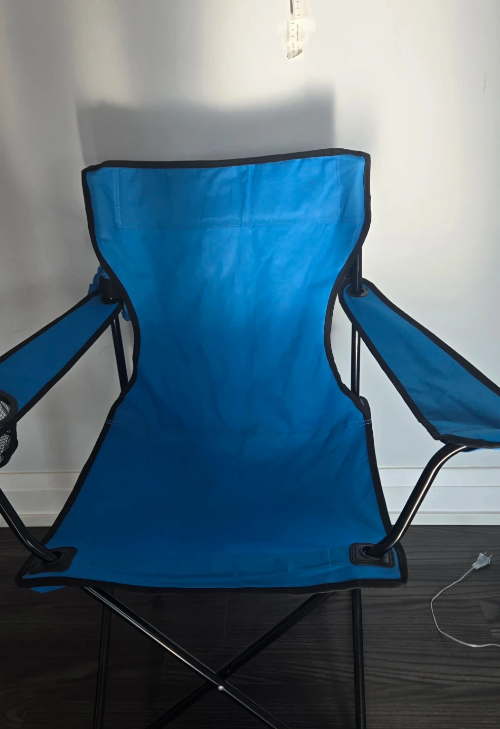 Two portable folding camping chairs, one blue and one red. These chairs are made with a durable fabric and metal frame, perfect for outdoor use. They fold up for easy transport and storage. Great for camping trips or backyard gatherings!