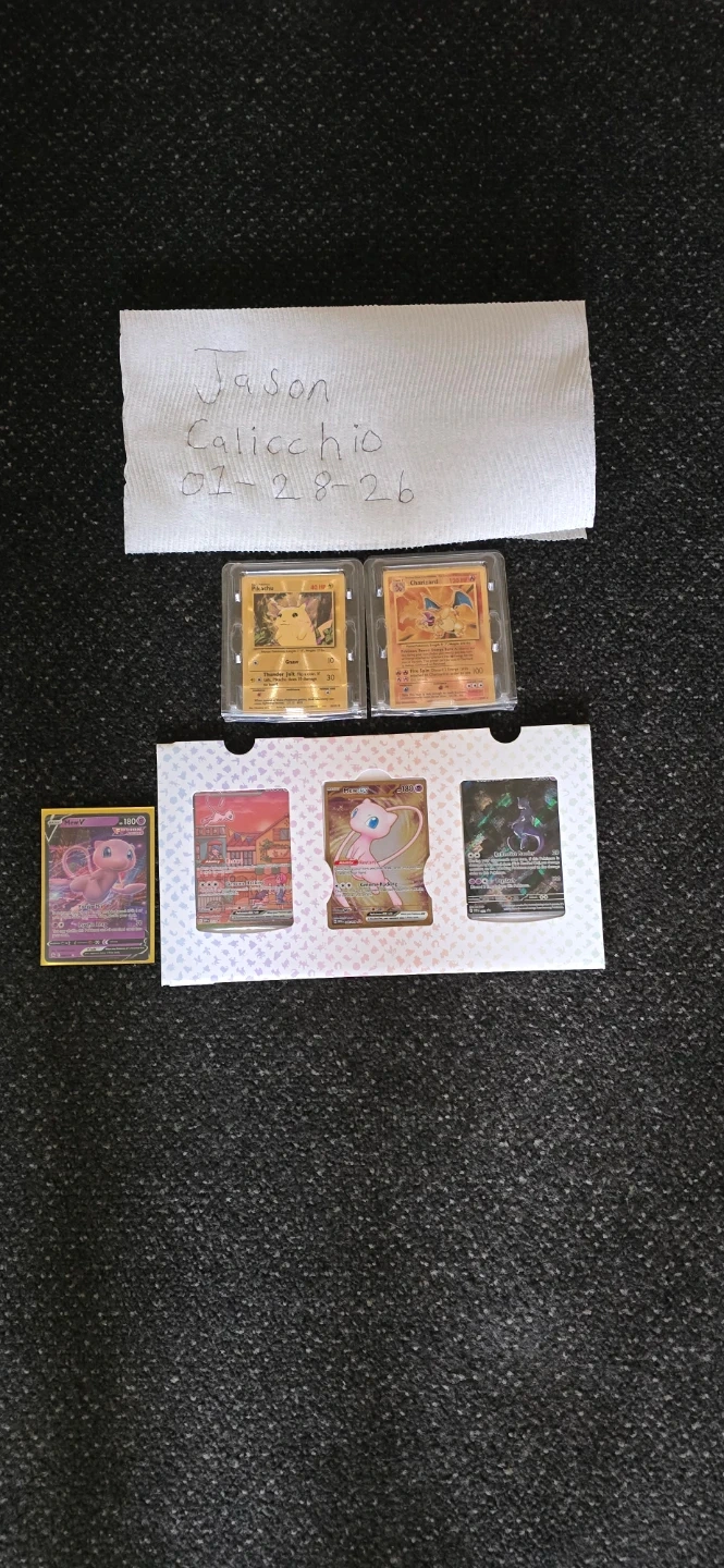 Selling a collection of Pokemon trading cards. Includes gold foil Pikachu and Charizard cards, plus Mew V and Mewtwo cards. These cards are in protective cases and a display holder.