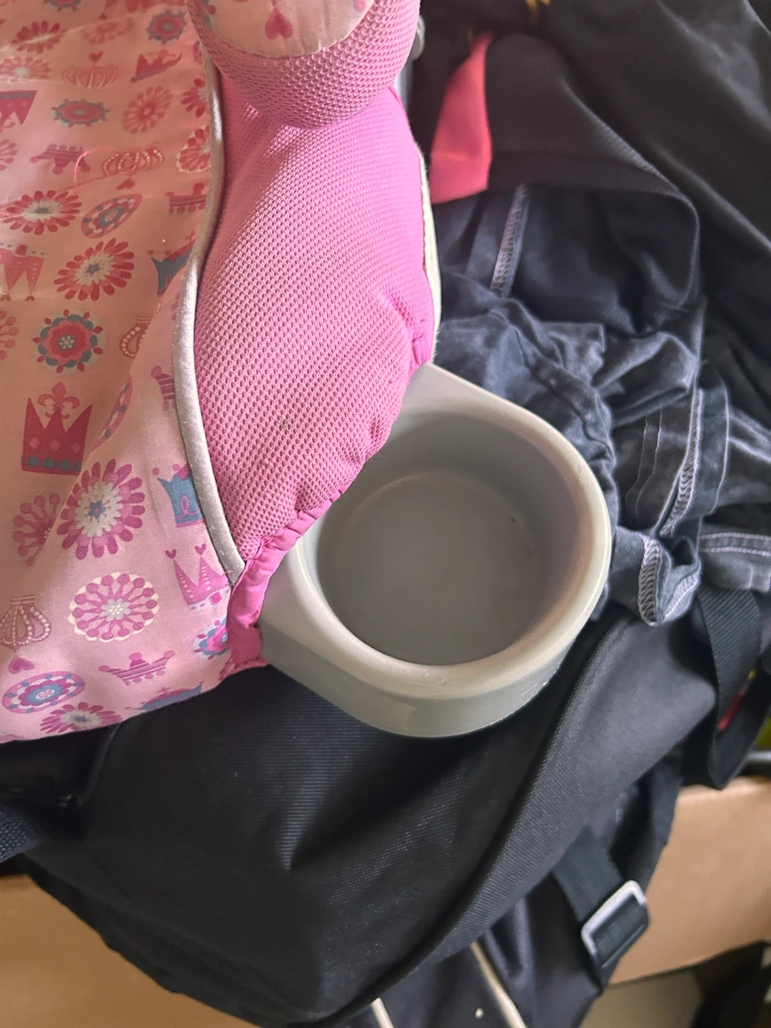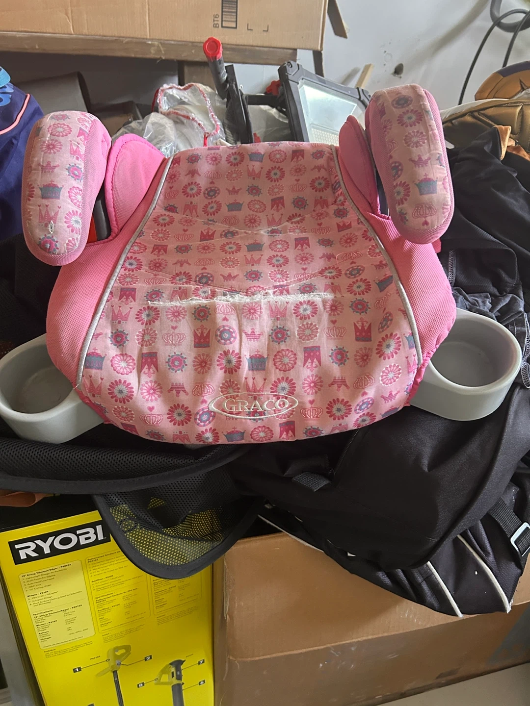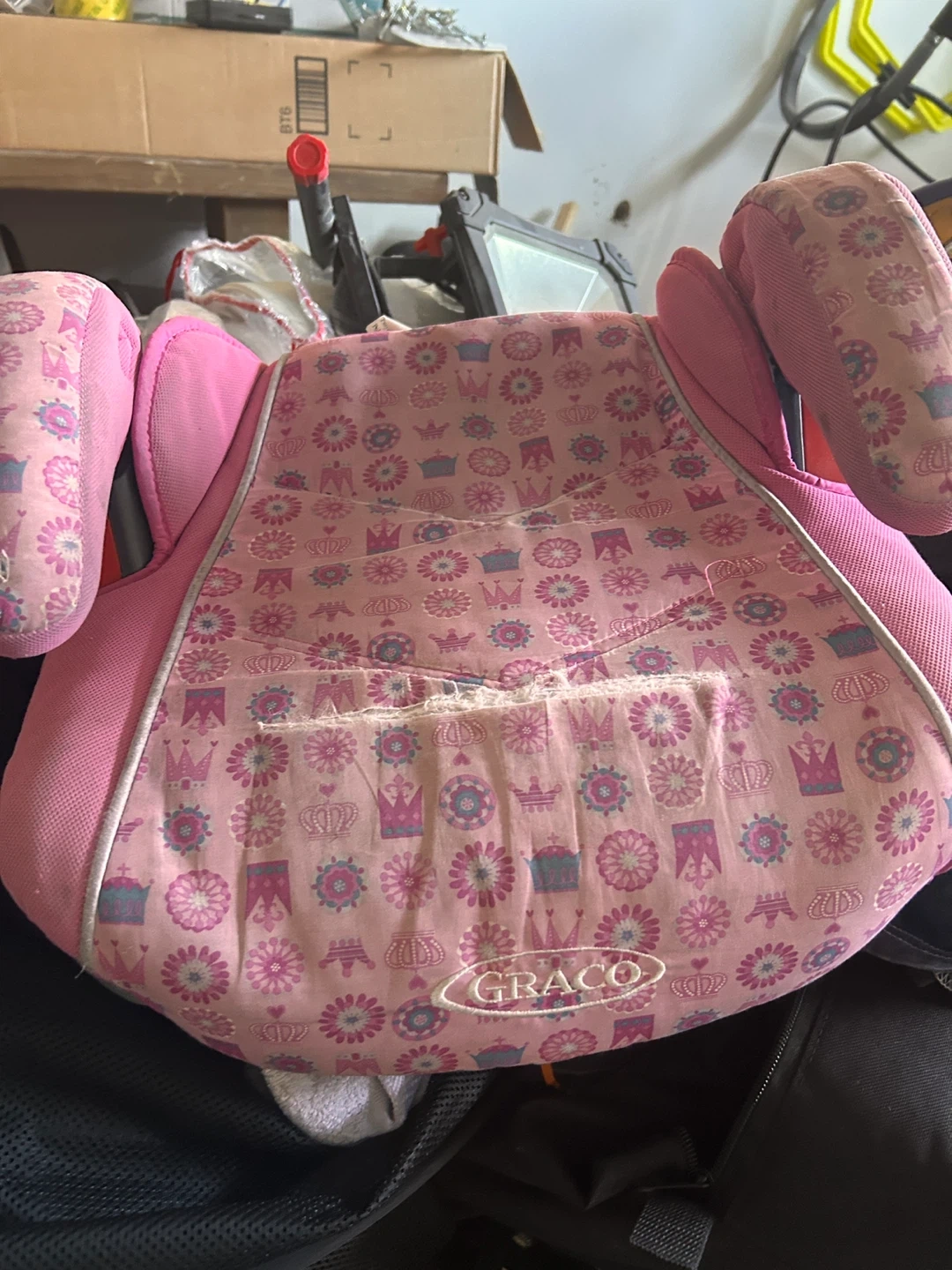 This is a pink booster car seat from Graco with a princess crown and flower pattern. It features two cup holders on the sides. Some wear is visible on the seat.