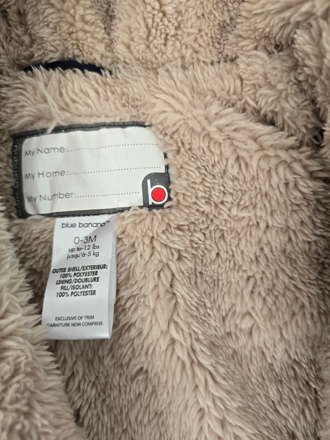 Cozy blue padded snowsuit with faux fur trim and a matching fleece lined striped hat. This 0-3 month size snowsuit is made with a 100% polyester outer shell and fill. It's great for keeping your little one warm during our polar vortex months!