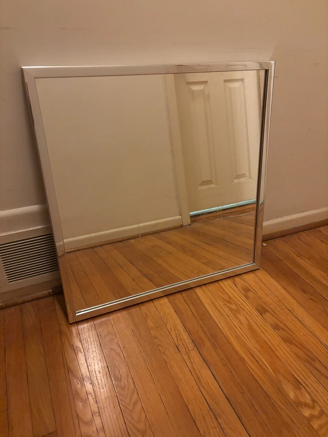 This is a 25x25 mirror with a sleek silver-tone frame. It's ready to hang and add a touch of style to any room. Its reflective surface is clean and clear.
